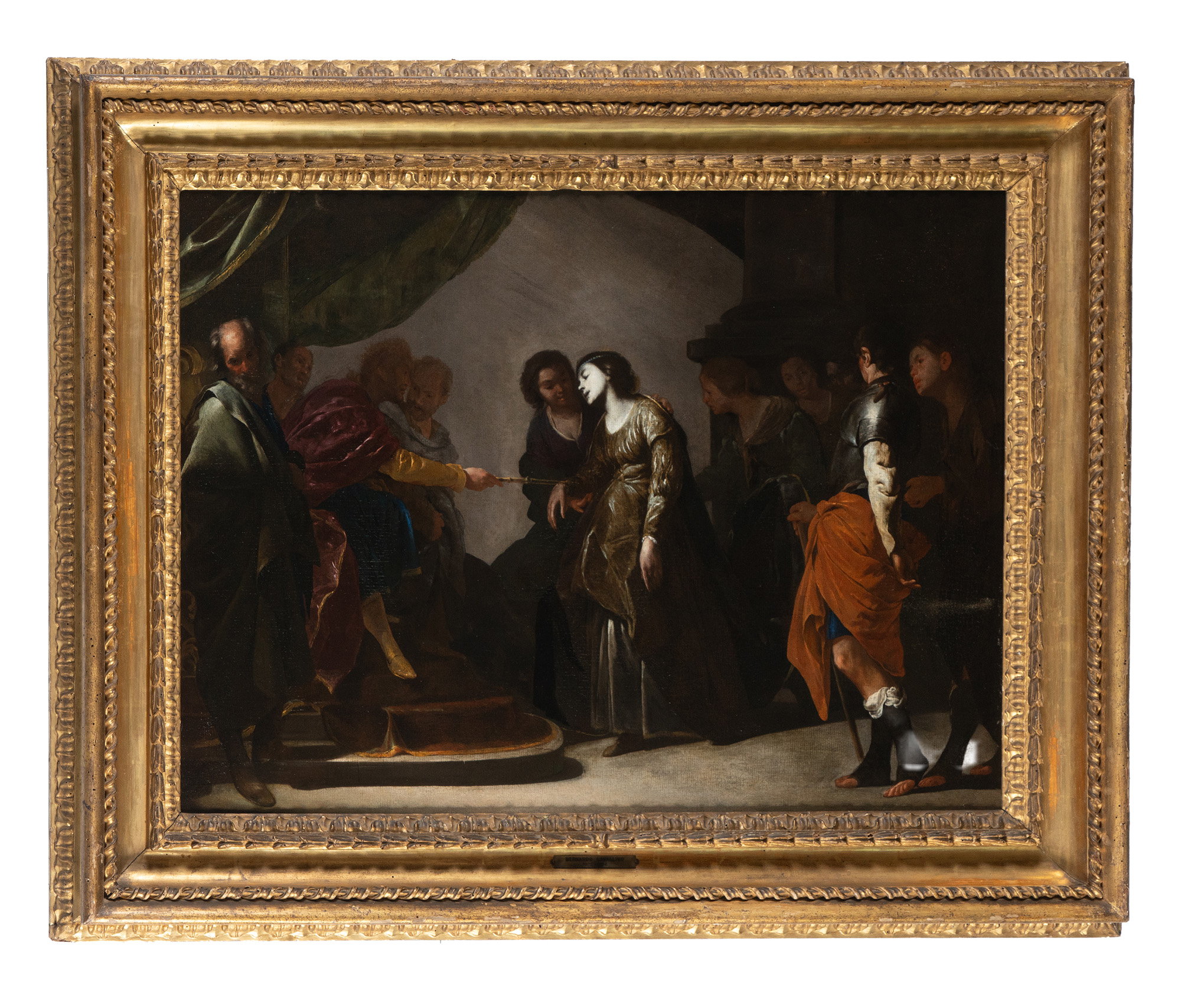Olio su tela.cm 76,5x103. Il dipinto, proveniente da collezione privata, è stato inserito da Nicola Spinosa nel catalogo ragionato dell'artista pubblicato a Roma nel 2013, così come il suo pendant conservato nella medesima raccolta e raffigurante Salomone e la Regina di Saba. L'artista eseguì più versioni di questo soggetto in momenti diversi della sua attività. La tela presente è raffrontabile a quella proveniente dalla raccolta Pagliara, oggi presso l'Istituto Suor Orsola Benincasa, databile ai primi anni Quaranta: il confronta autorizza l'ipotesi di un'esecuzione nello stesso giro di anni anche per la nostra versione. Un'ulteriore evoluzione quanto a materia pittorica e impreziosimento cromatico la si riscontra nel dipinto di identico soggetto della Galleria degli Uffizi (inv. P395) realizzato attorno al 1645 al tempo della piena maturità dell'artista. Bibliografia: N. Spinosa, Grazia e tenerezza "in posa": Bernardo Cavallino e il suo tempo 1616-1656, Roma 2013, p. 305-306, n. 39, fig. 39 b (1) In antica cornice dorata. Con la cornice: cm 103,5x129. Al momento della pubblicazione nella monografia del 2013 da parte di Nicola Spinosa, venivano segnalati nella scheda di catalogo "passati e malaccorti restauri", il dipinto viene presentato adesso dopo esser stato sottoposto a intervento di revisione e restauro da parte di Andrea Cipriani.