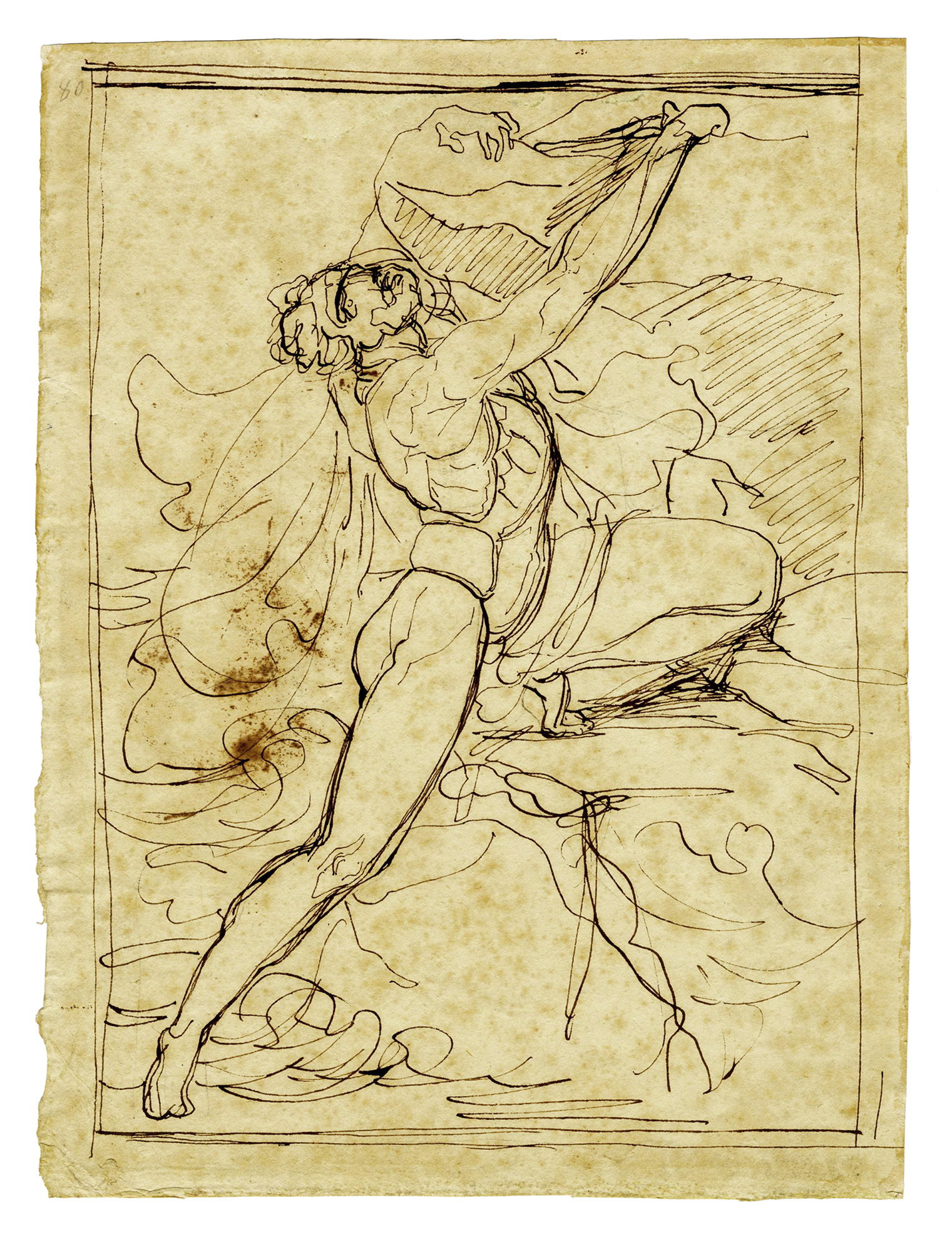 Penna e inchiostro bruno su carta non vergellata color avorio. mm 298x225. Il tema venne ripreso a vario titolo in ambito neoclassico, questo disegno ad esempio richiama il dipinto eseguito da Francesco Hayez nel 1822 così come la versione successiva datane da Luigi Croff (Mazzocca, 1994, n.60). La condotta grafica, veloce e a tratti decisi e graffianti d'inchiostro, sembra più affine a quella di Luigi Sabatelli che ai preparatori più composti e definiti, prevalentemente a matita nera, dell'ambiente accademico milanese. Francesco Sabatelli (1803-1829), figlio di Luigi replicò il soggetto in una variante oggi alla Galleria d'arte moderna di Firenze (Cat. Gen., n. 4) forse avvalendosi degli studi grafici del padre. (1) Traccia di lievi ma diffuse fioriture.