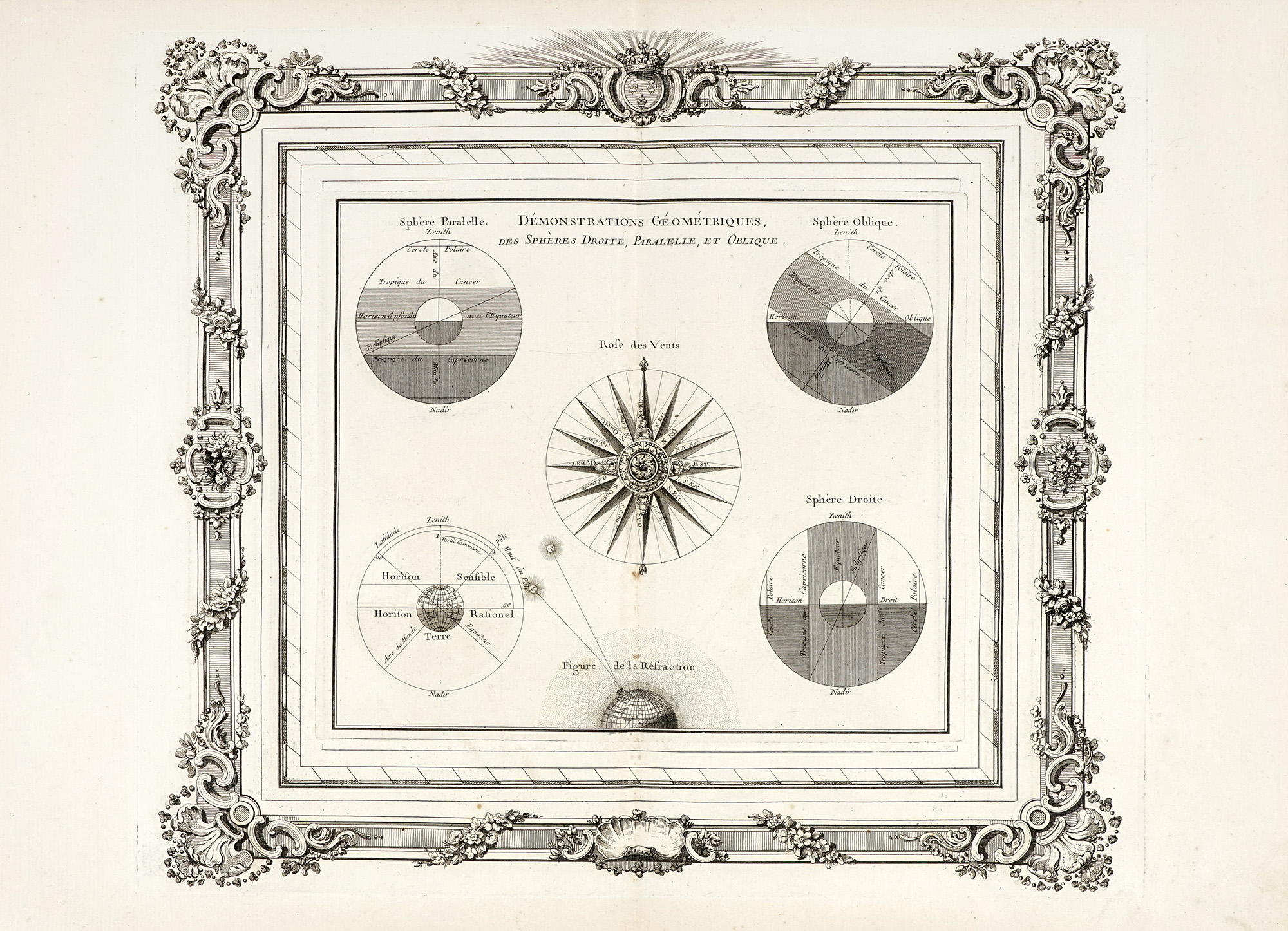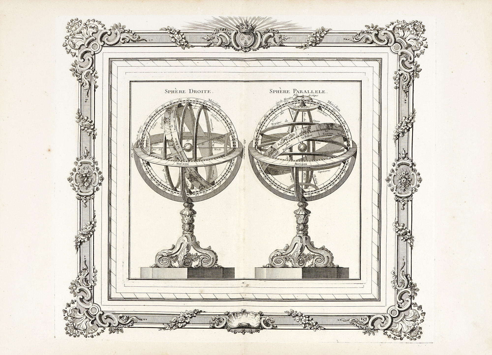 Incisione in rame. mm 235x267. Cornice decorativa su lastra separata: mm 353x58/72. Foglio: mm 394x540. Da Atlas General, Civil et Ecclesiastique, Methodique et Elementaire pour l'Etude de la Geographie et de l'Histoire, atlante destinato agli allievi de l'Ecole Royale Militaire e composto da tavole con sfere armillari, globi, raffigurazioni astronomiche, mappe degli stati e delle regioni del mondo, accompagnate da testo di Jean Charles Maclot. Coppia di sfere armillari su elegante piedistallo rococò, mostrano la terra lungo il suo asse, quindi lungo l'equatore con proiezione sulla volta celeste di tutti i punti che seguono la rotazione terrestre. Sono segnati equatore, i tropici e i circoli polari, la fascia dell'eclittica, la linea degli equinozi e dei solstizi; sono indicati anche l'asse passante per i poli e quello di rotazione. Si aggiunge tavola esplicativa con le rappresentazioni geometriche delle sfere parallele, rette ed inclinate, e rosa dei venti al centro del foglio. (2) Esemplari integri con margini come in origine. Piega di legatura verticale al centro con minimi residui di brachetta al verso. Lievissimo ingiallimento e sporadici punti di fioritura localizzati ai margini.