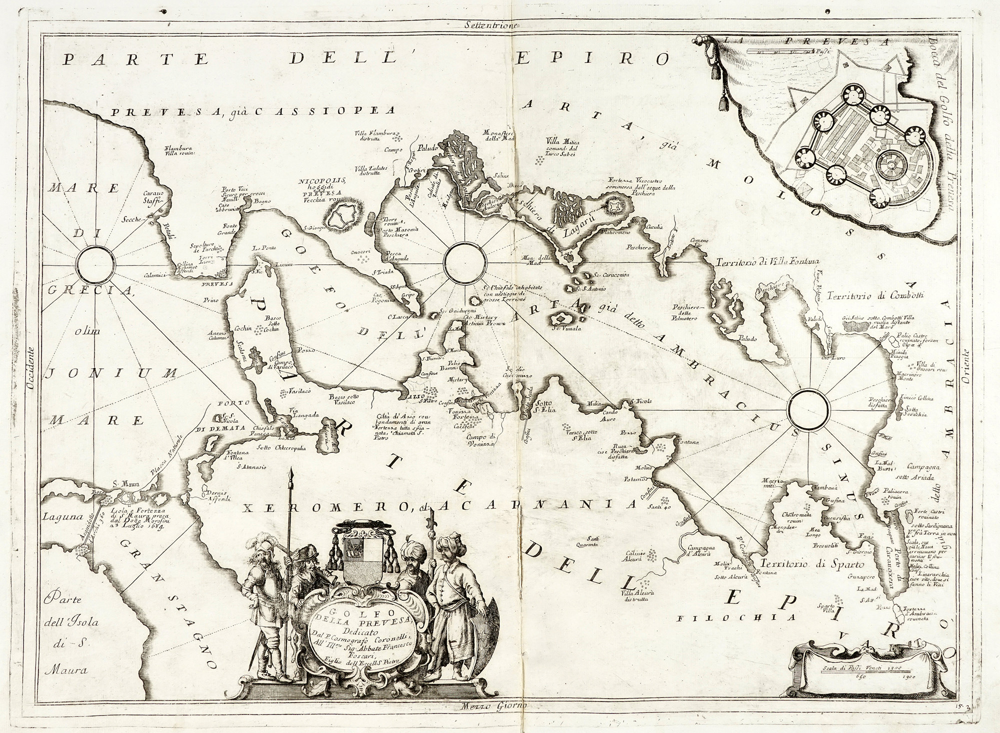 Incisione in rame. mm 460x615. Foglio: mm 490x680. Da Atlante Veneto, Nel quale si contiene la Descrittione Geografica, Storica, Sacra, Profana, e Politica, Degl'Impery, Regni, Provincie, e Stati, Dell'Universo ... Accresciuto di molte Tavole Geografiche, non piu publicate. Opera, e Studio Del Padre Maestro Coronelli Min: Convent ... Nell' Universita di Venetia, Ad Uso Dell' Accademia Cosmografica de gli Argonauti. Tomo I. In Venetia MDCXCI. Carta verosimilmente pubblicata per commemorare la cattura di Preveza, in Epiro, strappata dai Veneziani ai mori nel 1684. Viene raffigurata anche gran parte del Golfo Ambracio, oggi Golfo di Arta, uno dei maggiori bacini chiusi dello Ionio. In alto a sinistra la pianta della fortezza di Bouka, costruita dagli Ottomani a guardia dello stretto e potenziata dai veneziani dopo la conquista di Prevesa. (1) Foglio integro con margini come in origine. Piega di legatura in verticale al centro con alcuni punti di fragilità.