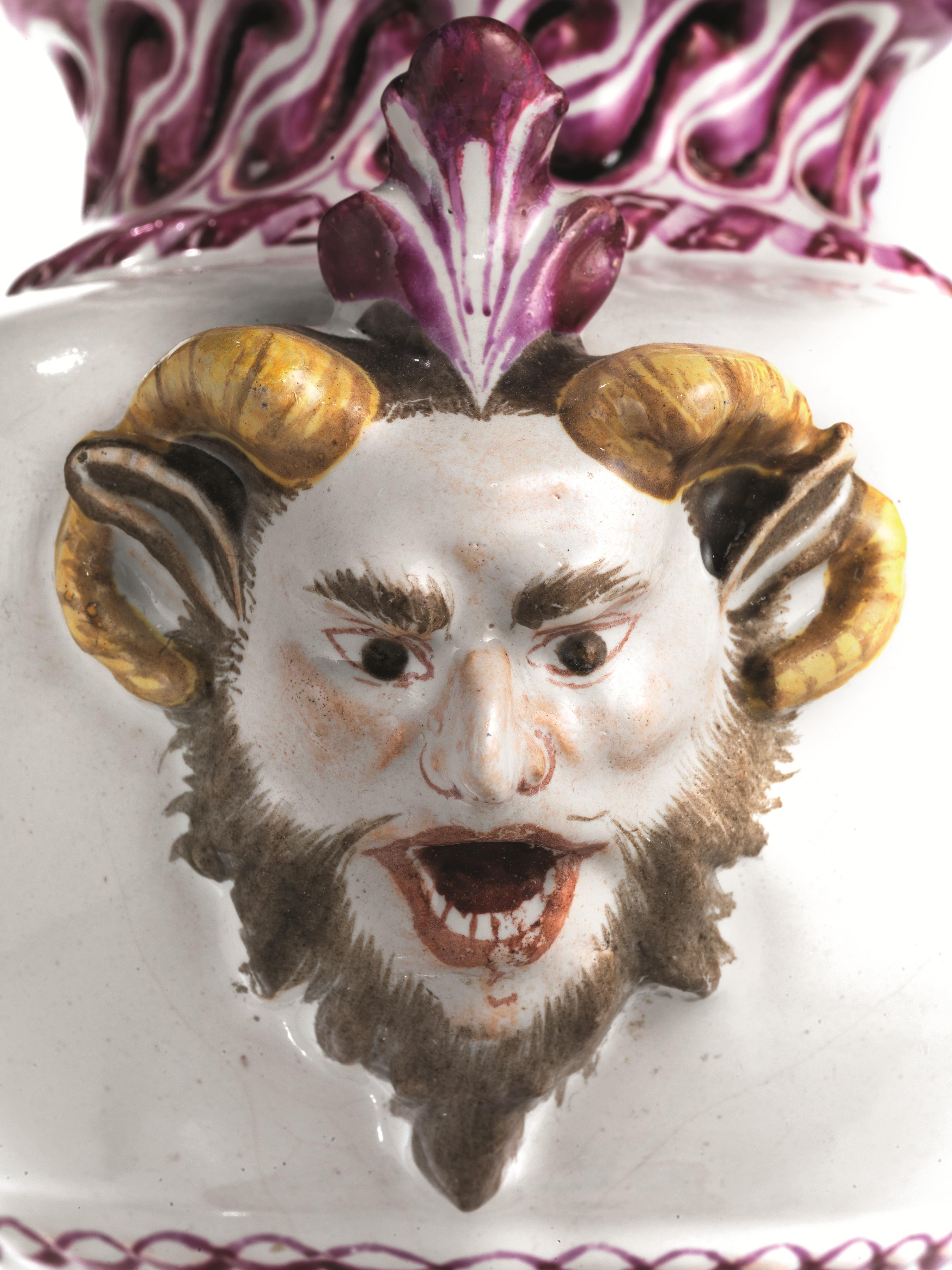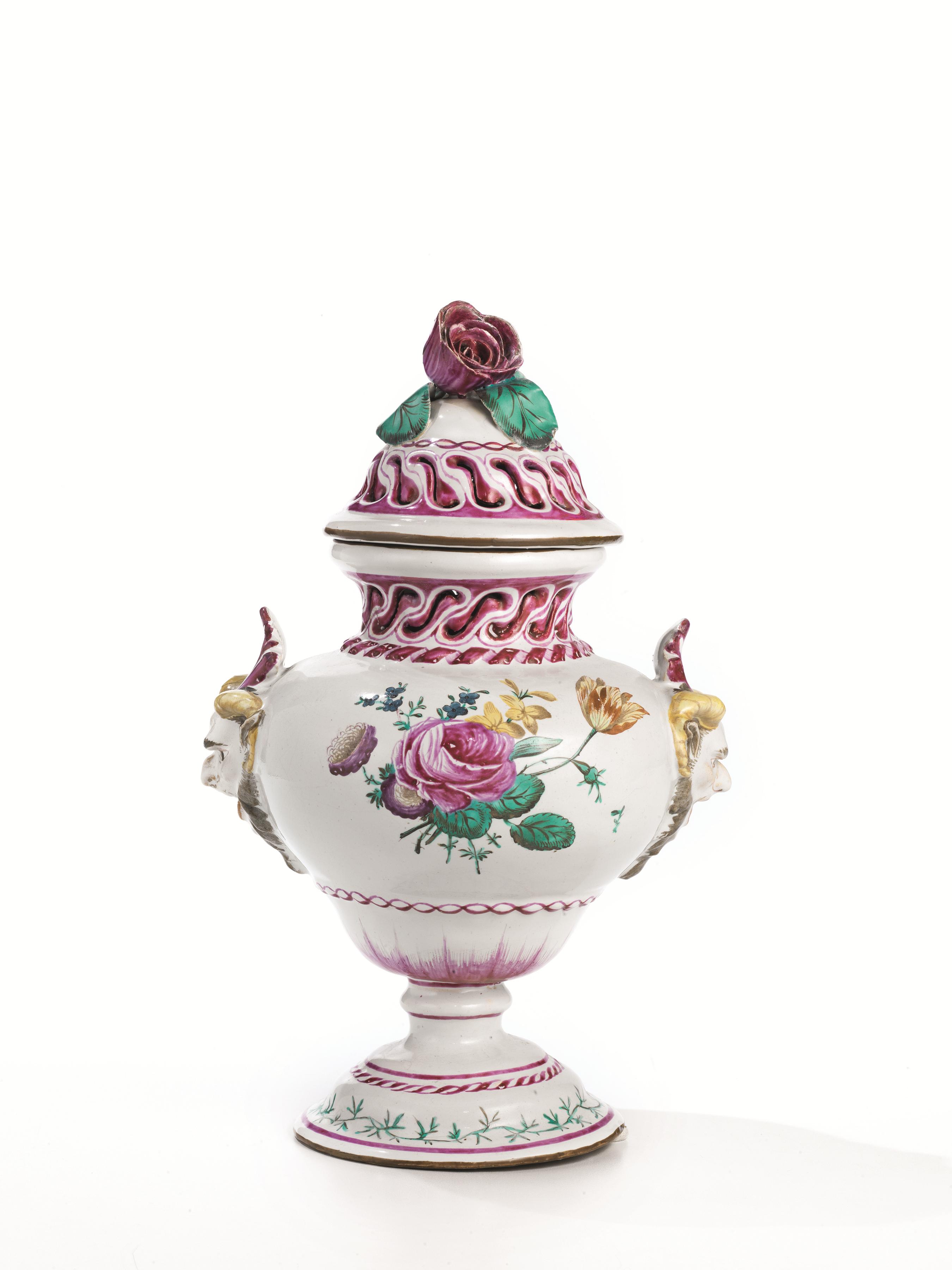 in maiolica decorata a piccolo fuoco in policromia con rosso, verde, giallo, bruno di manganese. Di raffinata fattura per plasticità ed ornato, il vaso mostra un decoro a mazzetto floreale al centro delle due facciate principali circondati da una modellazione a mascheroni posti a lato del corpo, in perfetto equilibrio formale con la base e la parte superiore, dove collo e coperchio sono appositamente predisposti con fori per la fuoriuscita dell’essenza profumata e inseriti in un’ampia fascia ad “S” lumeggiata in porpora. La ricercatezza formale legata alla funzione d’uso del manufatto è infine suggerita dalla bella presa a tralcio di rosa adagiata sul coperchio e dipinta a trompe-l’oeil, come appare anche su alcune tazze da puerpera marcate e pubblicate. Il termine francese pot pourri designa questa tipologia di vasi quali contenitori di una miscela di erbe e petali di fiori per profumare gli ambienti. Sigla “F.” tracciata in azzurro sotto la base, alt. cm 30