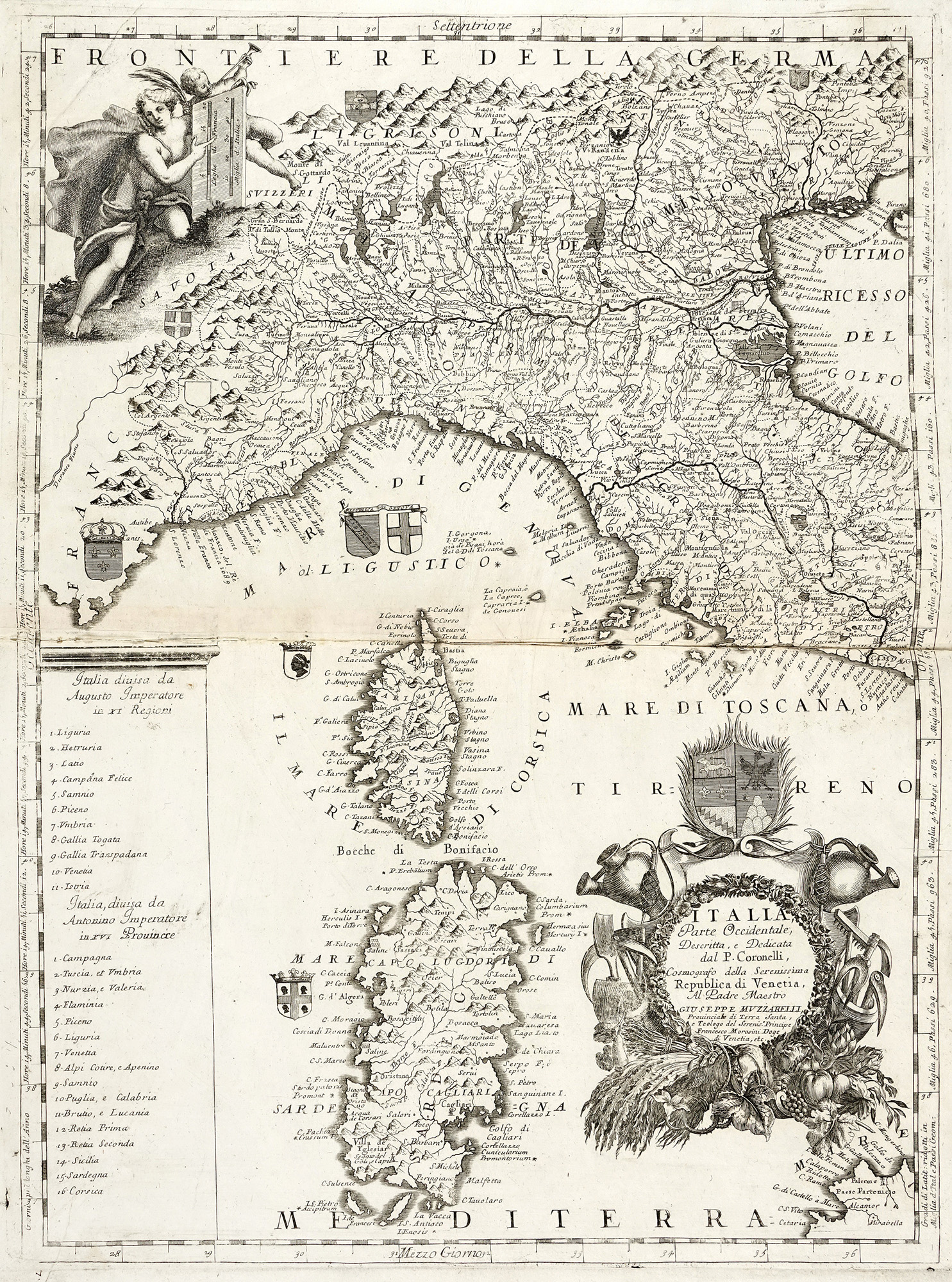 Vincenzo Maria Coronelli, Italia, Parte Occidentale, Descritta e Dedicata dal P. Coronelli, Cosmografo della Serenissima Repubica di Venetia, Al Padre Maestro Giuseppe Muzzarelli.../ Italia, Parte Orientale, Descritta e Dedicata Dal P. Cosmografo Coronelli, ... In Venetia: A'Spese dell'Autore, MDCLXXXXVI.
