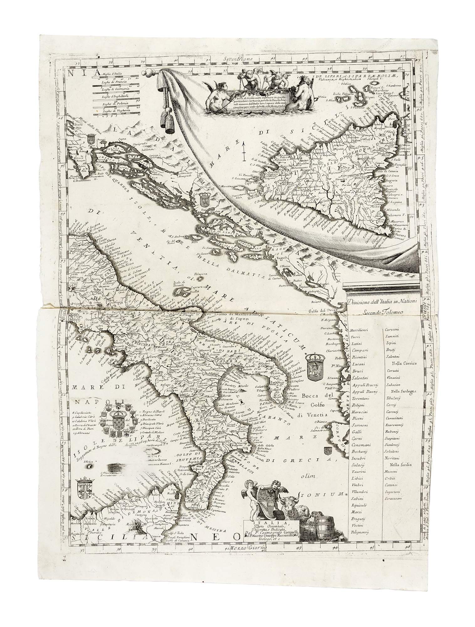 Incisione in rame. Ciascuna tavola mm 460x620. Foglio: mm 485x685. Imponente mappa dell'Italia in due tavole separate a doppia pagina, esemplificata in gran parte su quella di Giovanni Antonio Magini del 1608. Da Isolario Descrittione Geografico-Historica, Sacro-Profano, Antico-Moderna, Politica, Naturale e Poetica ... di Tutti l'Isole ... Tomo II dell'Atlante Veneto ... del P. Maestro Vincenzo Coronelli ... A 'Spese dell'Autore MDCLXXXXVI. Nell'inserto in alto a destra compare la Sicilia e si precisa come: "L'isola di Sicilia vien espressa in questa particolare Cartuccia perché la Tavola Generale annessa dell'Italia non è capace della medesima. Sono però descritte con la stessa graduazione". (2) Entrambi i fogli integri con margini come in origine. Piega di legatura in verticale al centro con minimo ingiallimento e con residuo di brachetta al verso. Lievi segni d'uso.