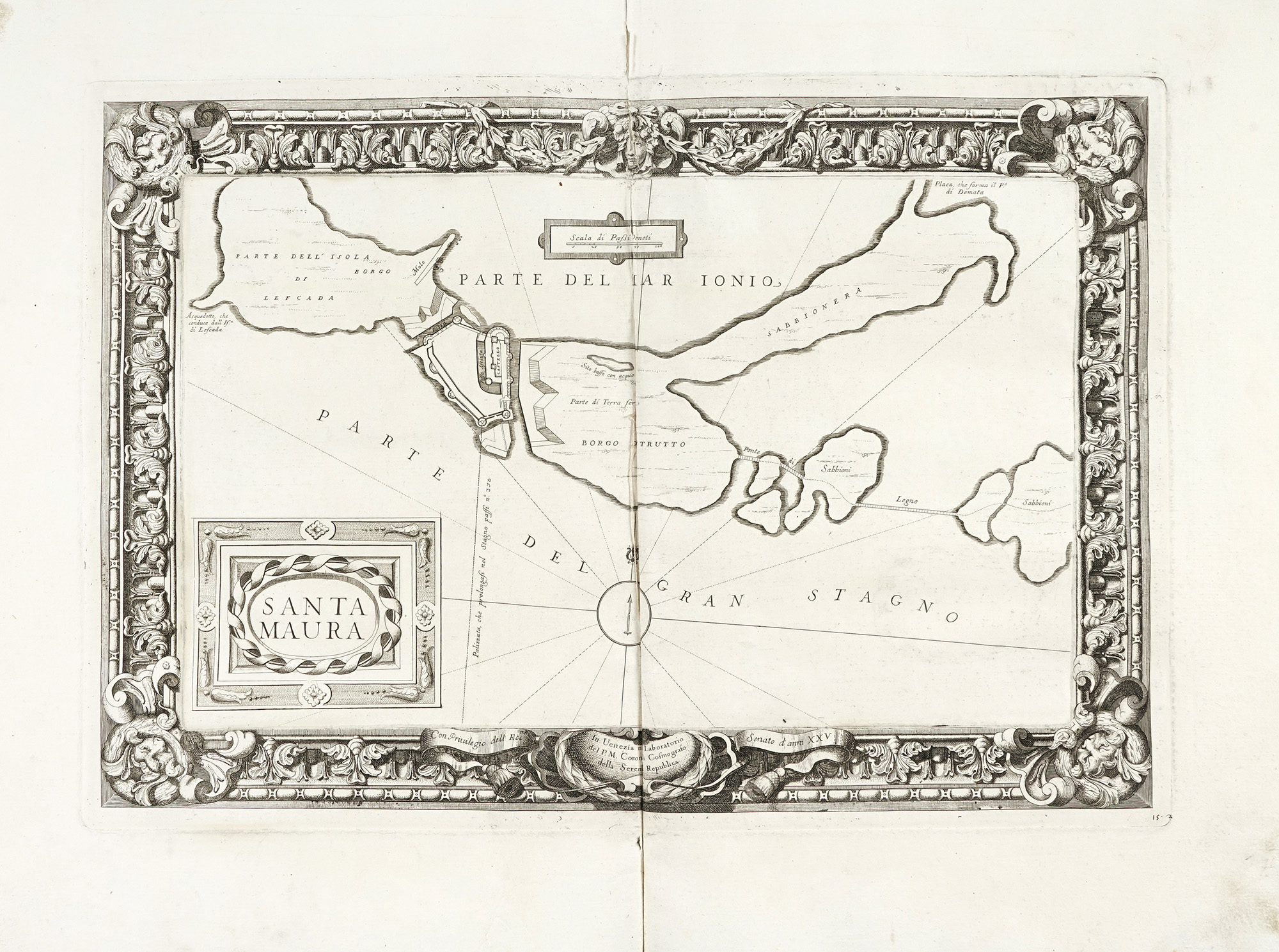 Incisione in rame. mm 270x434. Foglio: mm 490x670. Cornice decorativa su lastra separata: mm 50x533. Pianta dell'sola greca di Leucade, Santa Maura secondo la denominazione veneziana. Da Citta, fortezze, isole, e porti principali dell'Europa, in planta, et in elevatione, descritte, e publicate ad uso dell'Accademia Cosmografica degli Argonauti, in Venezia 1689. L'isola, possedimento ottomano, cadde sotto il dominio veneziano dopo un assedio durato dal 21 luglio al 6 agosto 1684. L'evento fu l'inizio della sesta guerra ottomano-veneziana chiamata anche Guerra di Morea. (1) Foglio integro con margini come in origine. Piega di legatura in verticale al centro con residui di cucitura al verso e inserto di carta a consolidamento nella parte alta della piega.