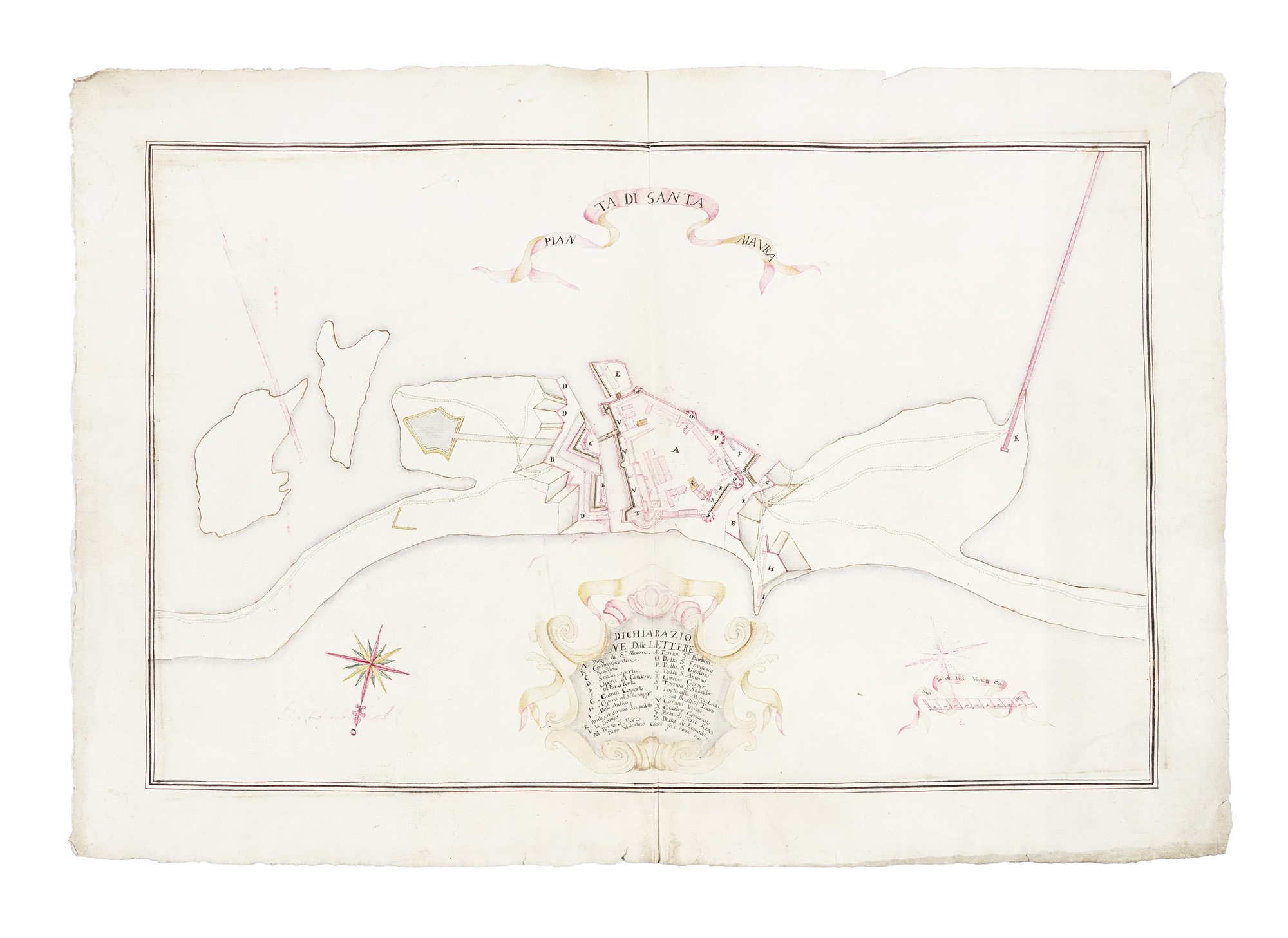 Penna e inchiostro bruno, acquerello a colori, carta vergellata pesante. mm 515x738. Mappa manoscritta dell'isola di Santa Maura (Leucade) con il titolo entro tabella a nastro in alto al centro. In corrispondnza in basso entro cartiglio decorativo Dichiarazione delle lettere con 23 rimandi contrassegnati da lettere ai luoghi notevoli. A seguire la firma dell'esecutore e la data "Piero Valentino Cosci fece l'anno 1744". In basso a sinistra rosa dei venti e a destra "Scala di Passi Veneti cento". Pianta dell'sola greca di Leucade, Santa Maura secondo la denominazione veneziana. L'isola, possedimento ottomano, cadde sotto il dominio veneziano dopo un assedio durato dal 21 luglio al 6 agosto 1684. L'evento fu l'inizio della sesta guerra ottomano-veneziana chiamata anche Guerra di Morea. (1) Foglio integro con margini intonsi. Piega verticale al centro. Uno strappo al margine in alto a destra, traccia di vecchia polvere e lievi difetti localizzati alle estremità.