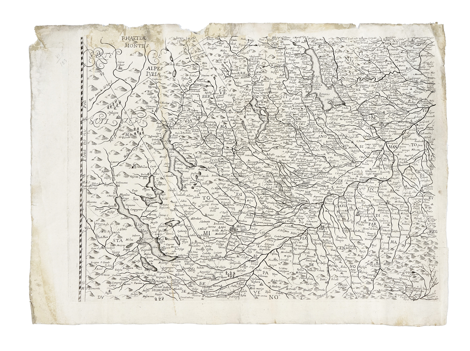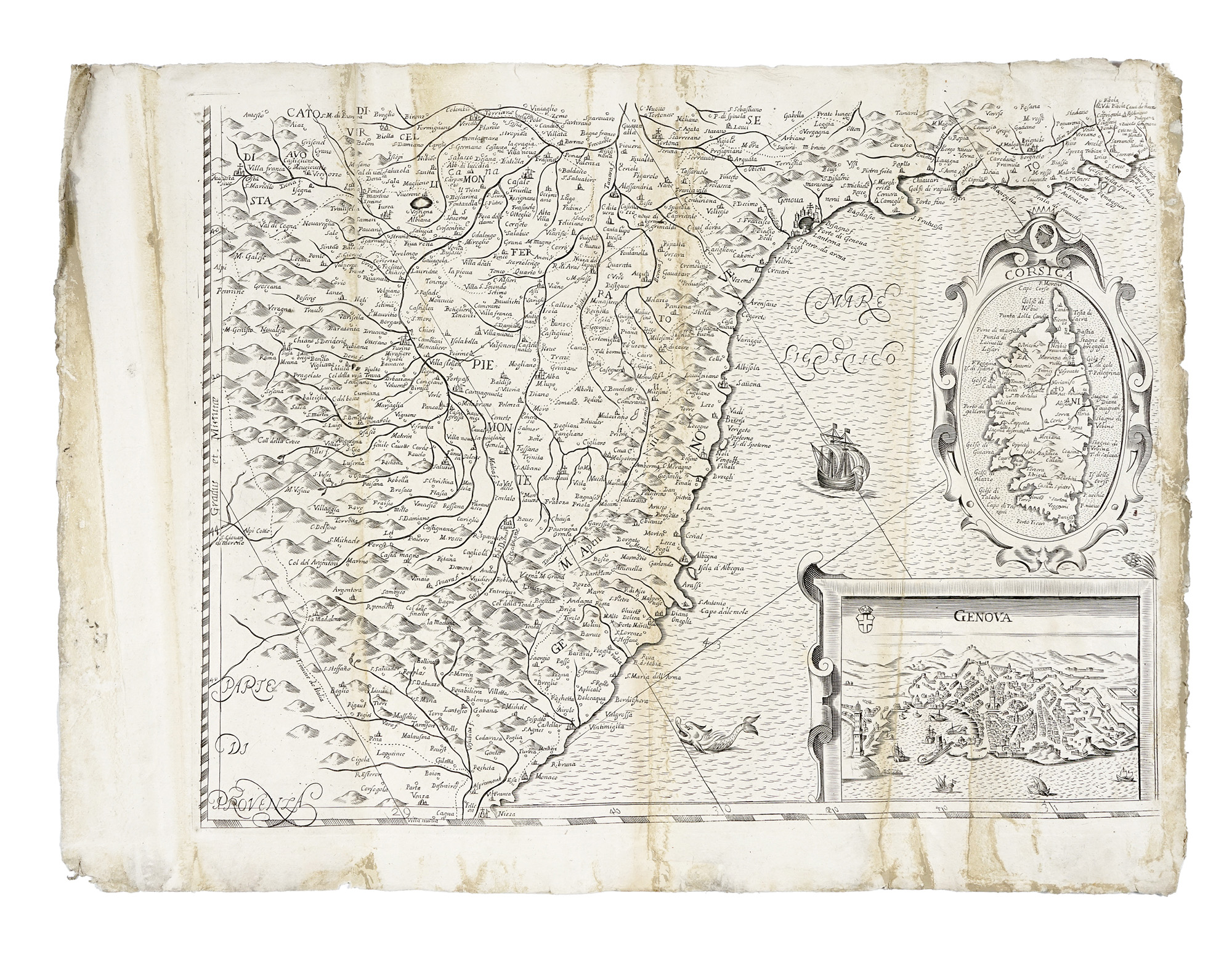 Acquaforte e bulino. mm 395x515/530. Foglio: mm 440x600. Tavole dedicate al Golfo di Genova, con la riviera da La Spezia a Nizza, e al Ducato di Milano, facenti parte della grande e rarissima mappa dell'Italia in 12 lastre incisa originariamente da Greuter nel 1630. Le due mappe presenti appartengono all'edizione del 1676 a opera di Giuseppe Longhi con lastre reincise da Pietro Todeschi nel 1675. Nella tavola con il Golfo di Genova a destra compaiono l'isola di Corsica entro medaglione in ovale e la mappa di Genova in tabella rettangolare; nello specchio d'acqua veliero e delfino. La carta con il Ducato di Milano costituisce la tavola immediatamente soprastante quelladedicata al Golfo di Genova. Vi troviamo raffigurati tuttii grandi laghi, il Lago Maggiore, il Lago di Como, il Lago di Lugano e il Lago d'Orta, e spostati a Est il Lago d'Iseo e il Lago di Garda. Ancora a destra il territorio di Mantova e il Ducato di Parma. Bellissime impressioni stampate con segno pieno su carta vergellata con filigrana "testa in cerchio singolo su cartiglio con lettere". (2) Fogli integri con margini intonsi. Traccia di piega verticale al centro e di alcune lievi in parallelo. Mancanza in alto alla tavola con il Ducato di Milano. Minimi strappi e lievi difetti localizzati alle estremità. Zone di ingiallimento e presenza di vecchia polvere.
