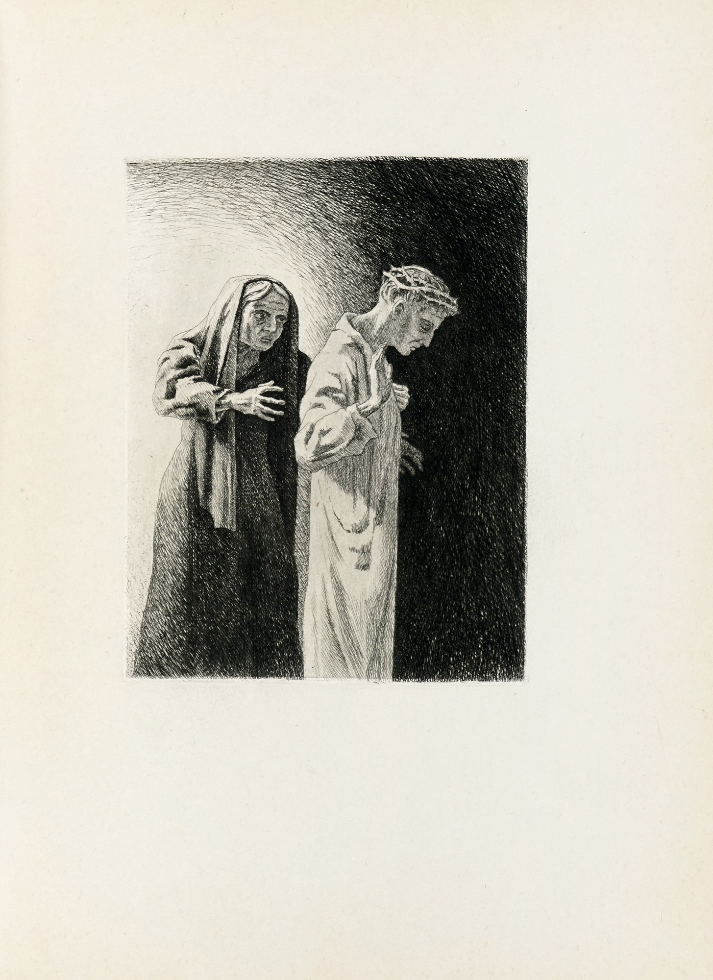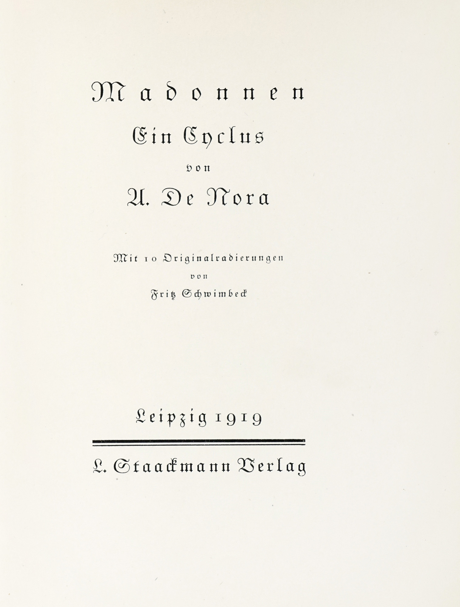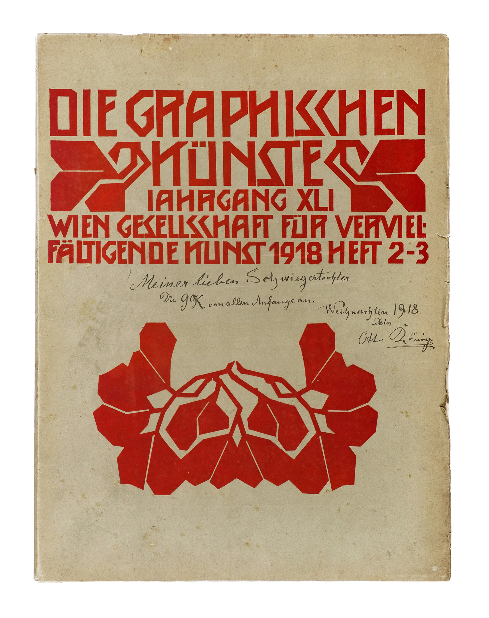 1) Mayrink G., Der Golem. Con 8 illustrazioni litografiche di Steiner-Prag H., Lipsia, 1915. Nota manoscritta ad inchiostro di china bruno alla prima carta bianca. In riccamente decorata legatura con titoli impressi ai piatti e al dorso. 2) De Rora U., Madonnen Ein Cyklus. Con 10 meravigliose illustrazioni all'acquaforte di Schwimbeck F., Lipsia, 1919. Titoli impressi in oro al dorso. SI AGGIUNGE: Autori Vari, Die Graphischen Künste. 1918. Cartella con testi e incisioni di autori vari con dedica manoscritta al piatto anteriore. (3) Minimi difetti, altrimenti ottima conservazione generale.