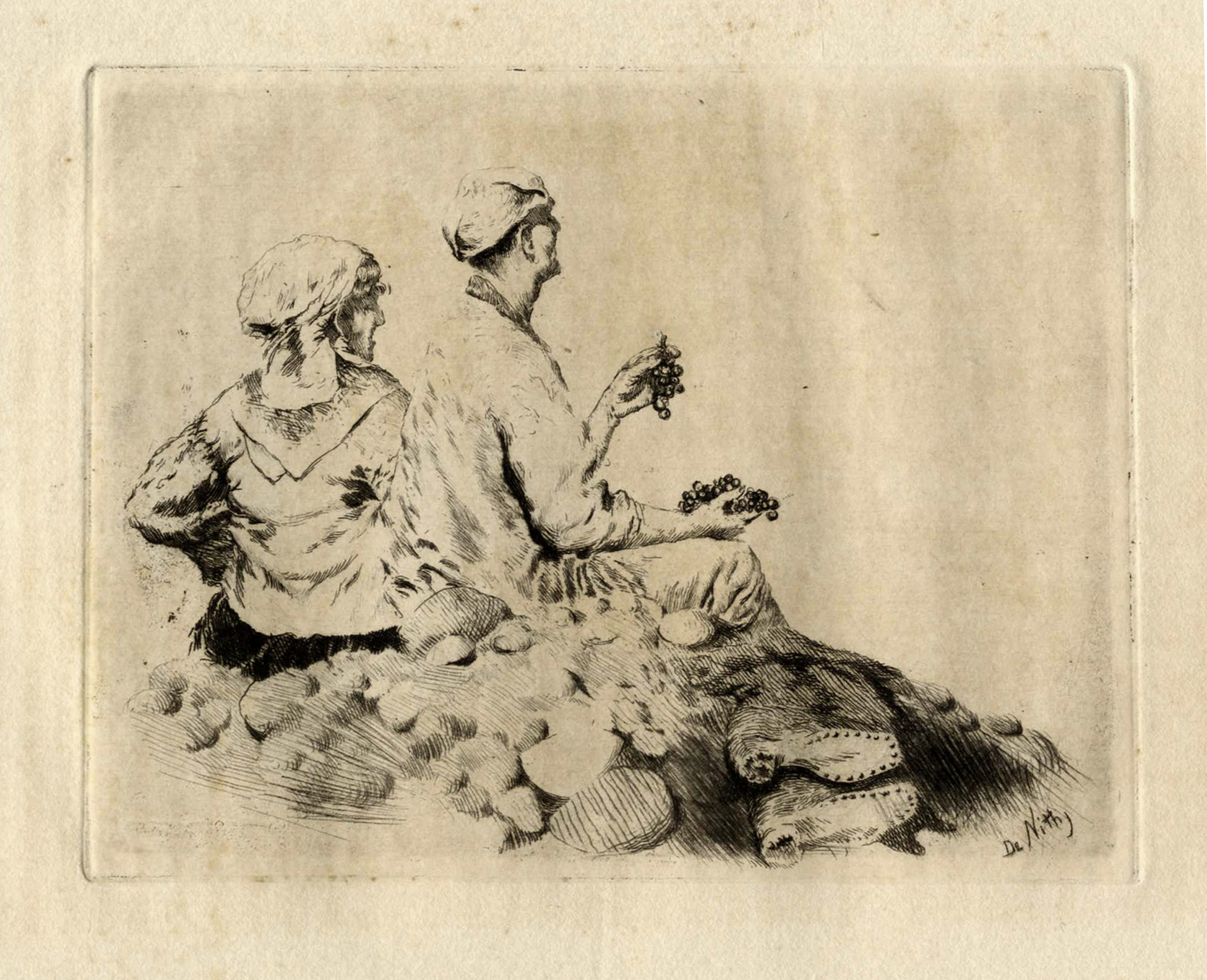 Acquaforte. mm 110x135. Foglio: mm 190x280. FIORANI-DINOIA, n. 33. Esemplare di 3° stato come pubblicato nella "Gazette des Beaux Arts". Firmata nella lastra in basso a destra. L'incisione riproduce in controparte un particolare di un dipinto a olio dell'artista (Sulla strada di Castellamare), appartenente ad una tematica lontana da quella mondana cara al De Nittis parigino (cfr. Caroppo 1998, p. 100). L'acquaforte, eseguita a partire dal 1875, è stata pubblicata sulla "Gazette des Beaux-Arts" nel 1876. (1) Impressione inferiore della lastra sbiadita. Foglio parzialmente applicato a passe-partout di supporto. Margini con minimi difetti.