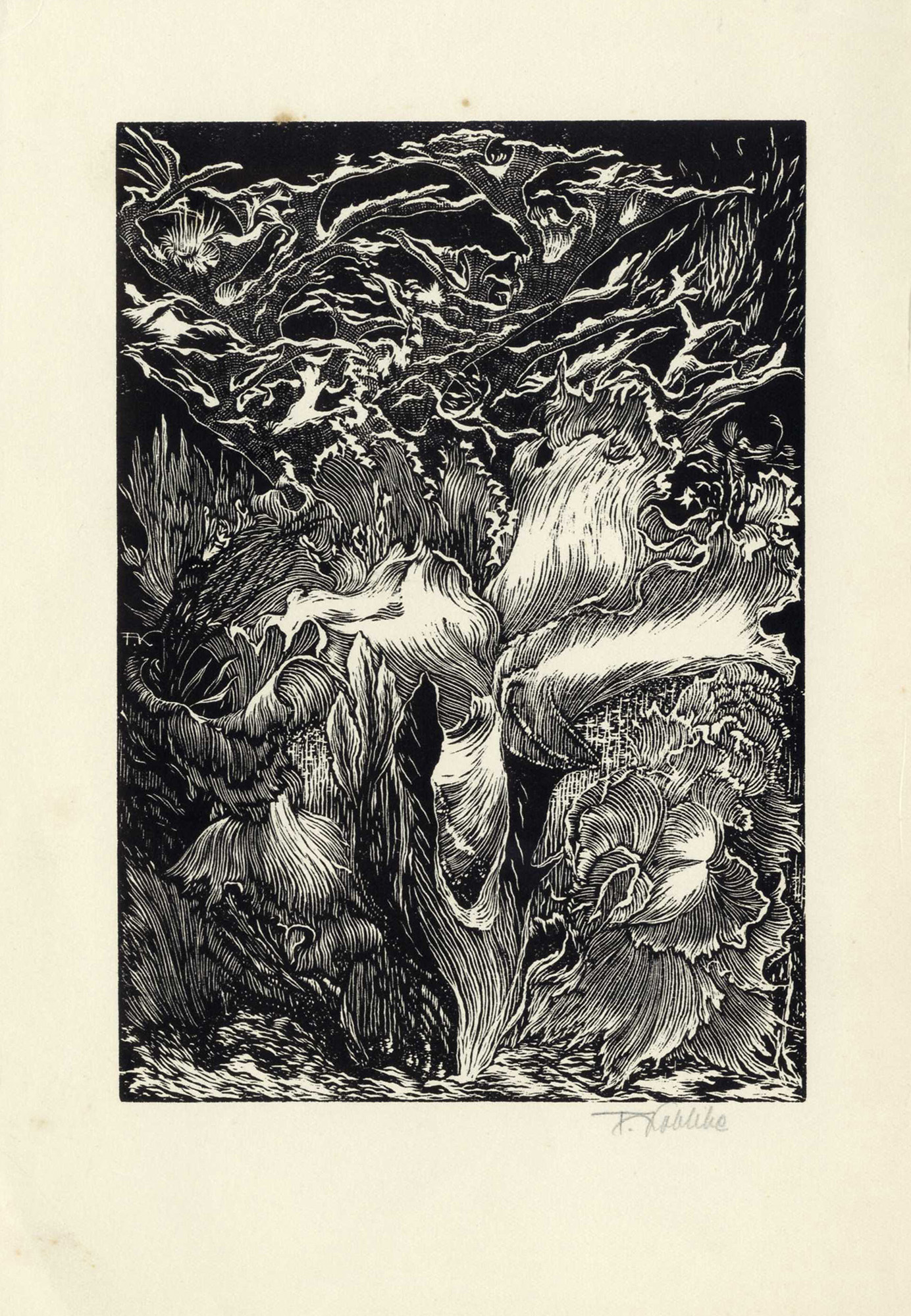 Xilografie. mm 85/160x55/110. Fogli: mm 120/220x85/150. Tutte firmate o monogrammate in lastra. Una datata in lastra. Due firmate a matita in basso a destra. Compongono il lotto uno studio decorativo floreale e tre ex libris. (4) Ottima conservazione.