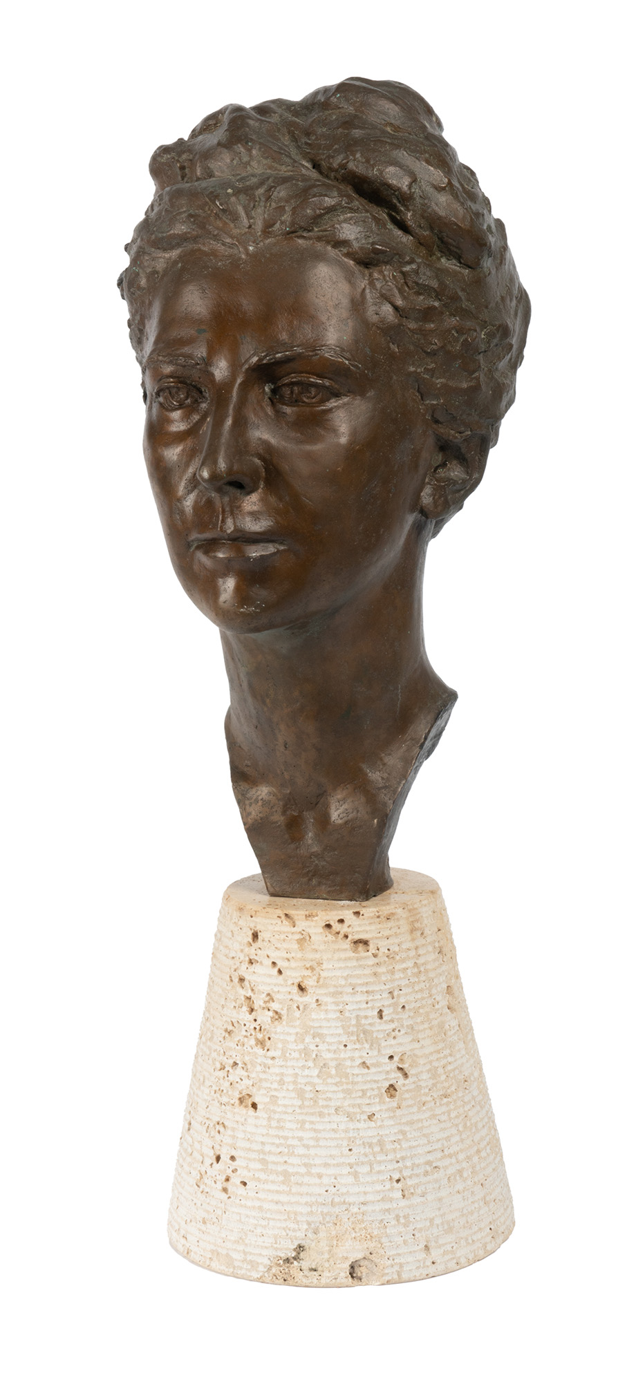 Anonimo del XIX secolo, Volto femminile. Bronzo e pietra. cm 65x33x20. Reca...