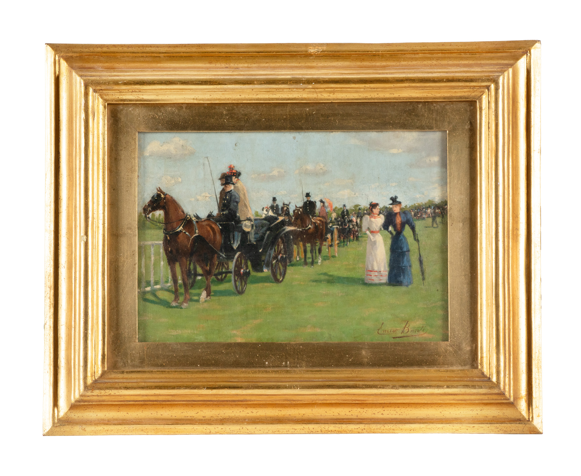 Enrico Banti, Corse all'ippodromo (All'Ardenza). Olio su tela. cm 23,5x33,5....