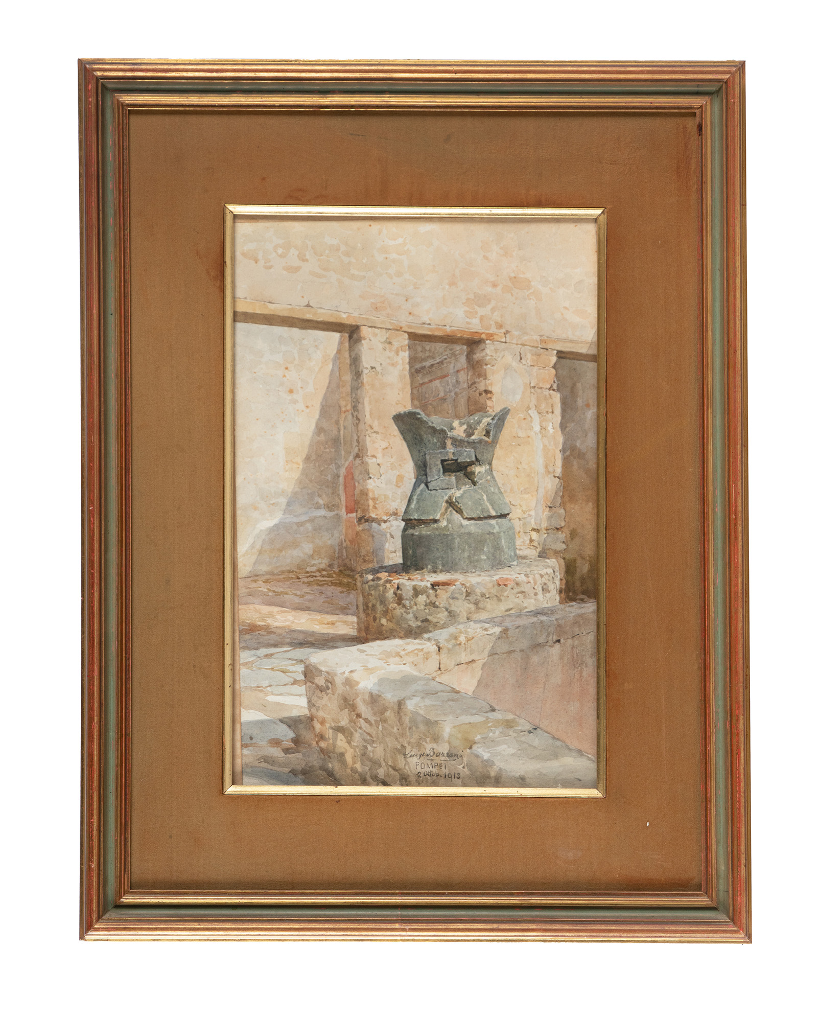 Acquerello su cartone. cm 37x25. Firma, data e titolo in basso al centro. Noto per le sue meravigliose e precise vedute archeologiche e architettoniche, l'artista è presente con varie opere al Museo Archeologico Nazionale di Napoli. (1) In elegante cornice: cm 51x40. L'opera presenta qualche macchiolina ma è in buona conservazione generale.