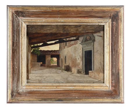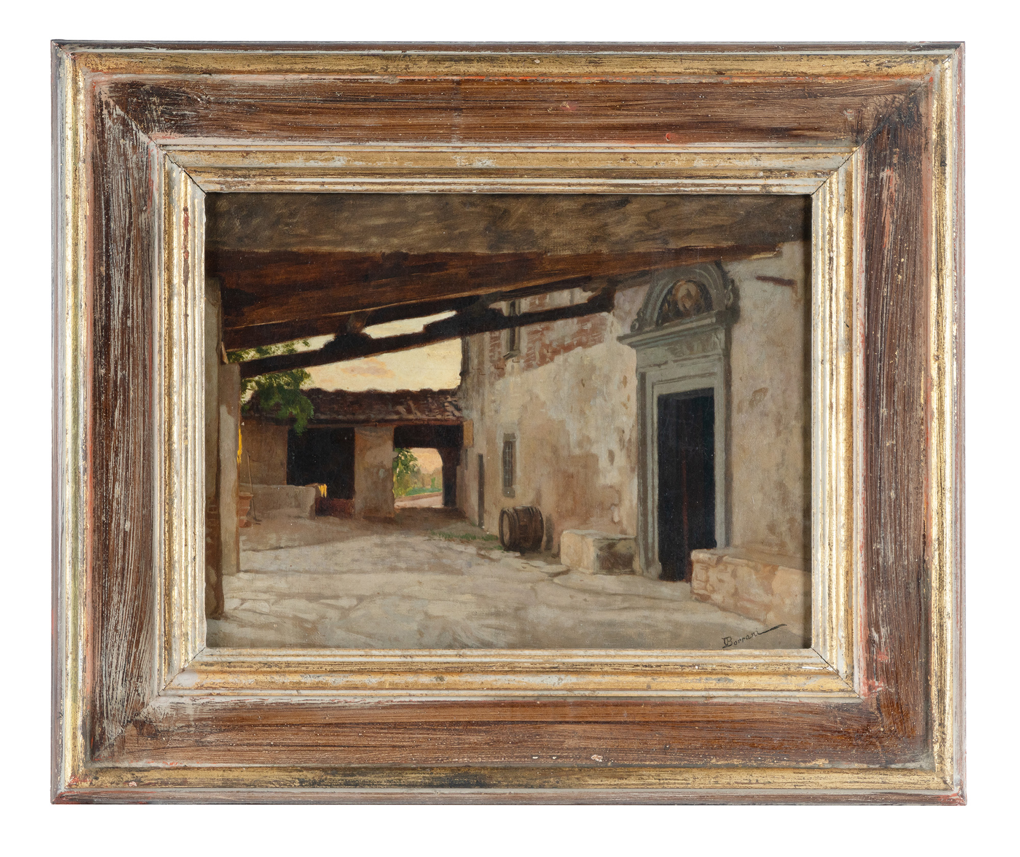 Olio su tela. cm 30x40. Firmato in basso a destra. Bozzetto per l'omonimo quadro datato 1869. Nella versione finale del dipinto troviamo una cerchia di familiari raccolta intorno al giovane militare in partenza. Borrani nell'opera vuole sottolineare le umili origini del nucleo familiare lasciando tutte le figure, meno che il soldato, scalze. (1) In cornice lignea con vetro: cm 49,5x59. Trascurabili difetti di superficie, altrimenti ottima conservazione.