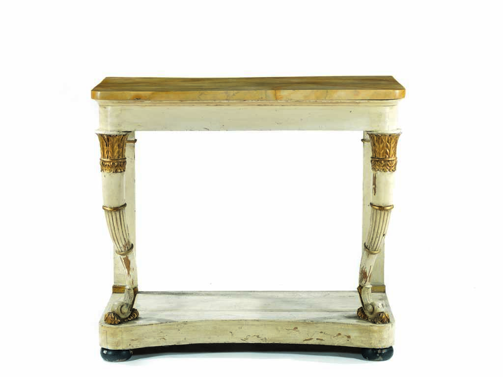 Console, en suite con i lotti precedenti, in legno intagliato e laccato bianco e oro, piano rettangolare con angoli stondati in marmo giallo di Siena, sostegni anteriori modellati a cornucopia e posteriori a lesena, sottopiano sagomato, piedi a cipolla schiacciata, cm 114x58x102, reca antico cartellino Monsignor Francesco Barry, Siena, piccoli danni e riprese alla pittura