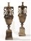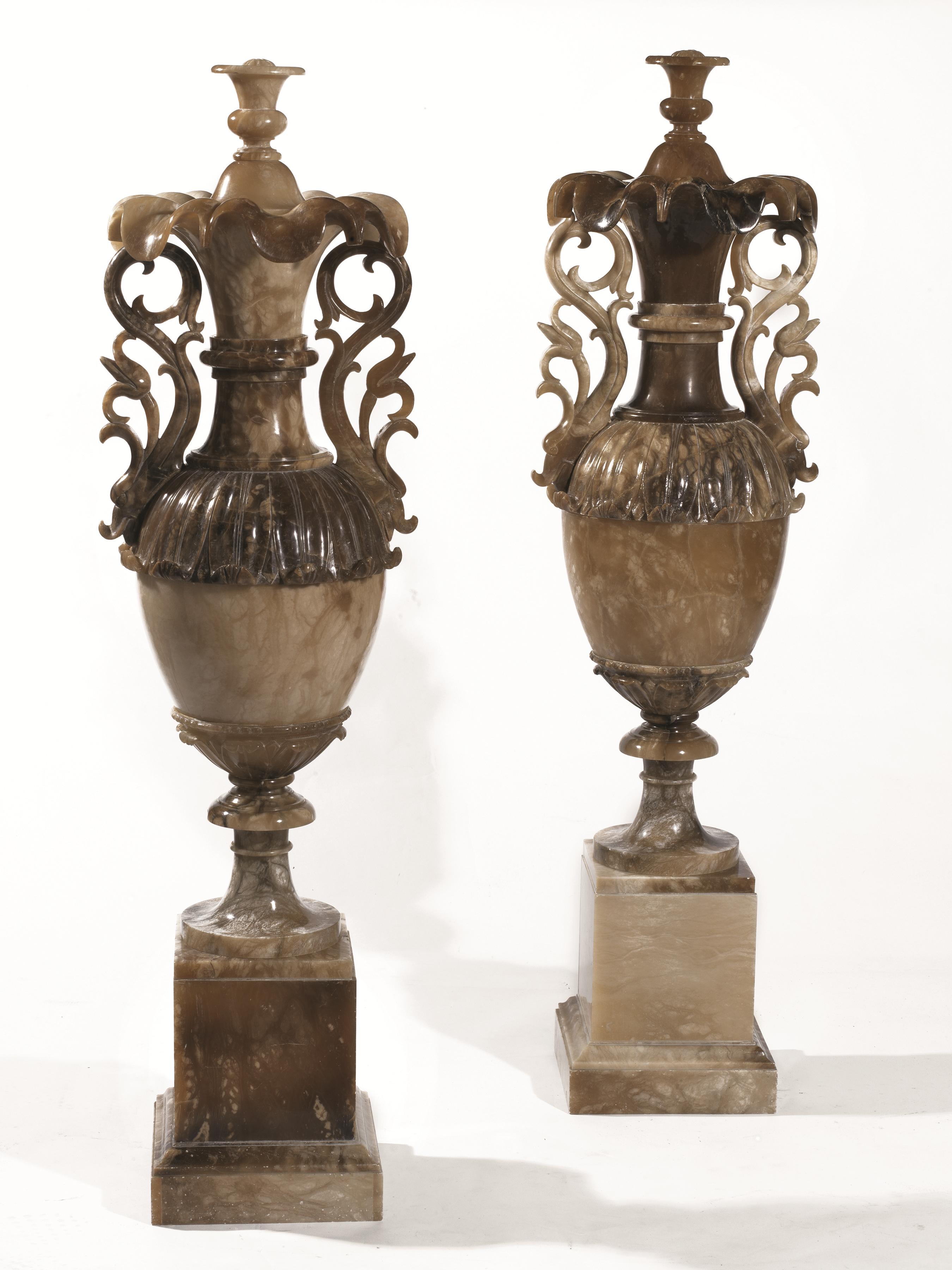 in alabastro scolpito, corpo ovoidale su base a plinto, due anse a volute traforate, alt. cm 120 (2)