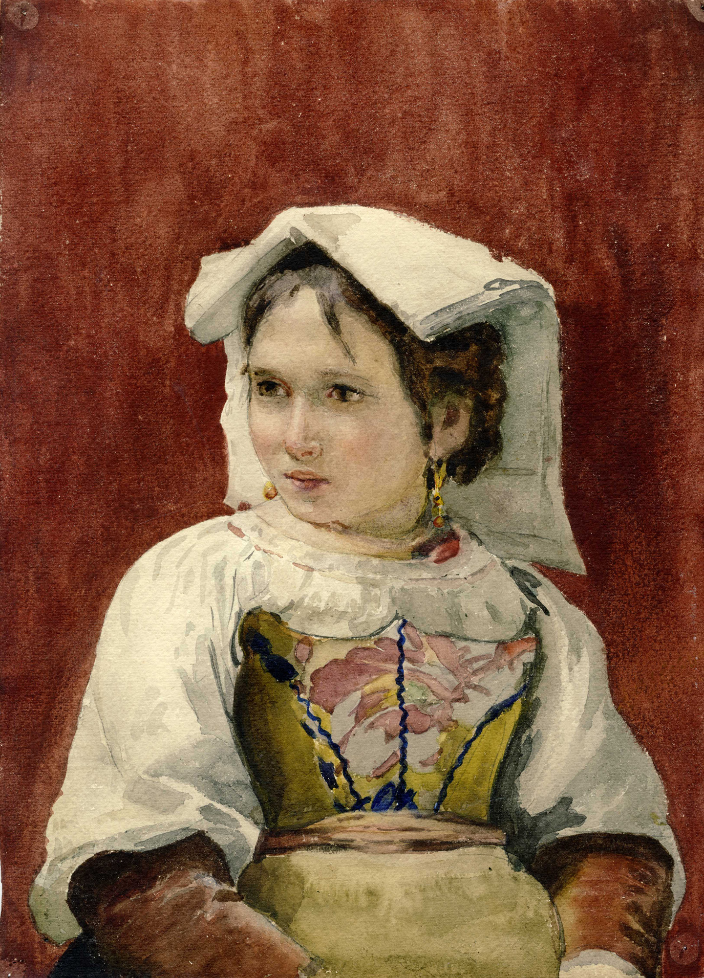 Matita e acquerello su carta greve. mm 380x280. Al verso iscritto: "F. Faruffini". (1) Segni di affissione agli angoli e qualche minuscola caduta di colore, altrimenti ottima conservazione.