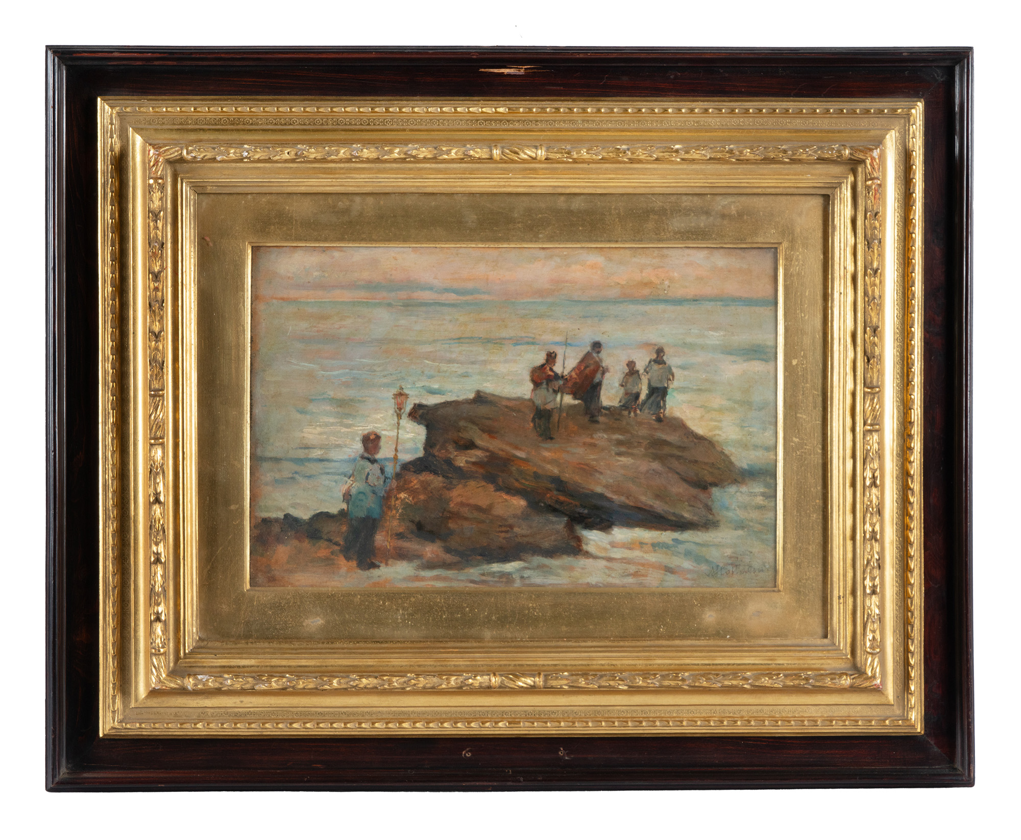 Olio su tavola. cm 20x30,5. Firmato a matita in basso a destra. Timbro ad inchiostro sbiadito di "Articoli per la pittura di Zolfanelli e Neri di Firenze", etichetta del corniciaio Giuseppe Salvestrini di Firenze ed ulteriore etichetta a stampa recante i dati dell'opera al verso. (1) In cornice lignea con vetro: cm 42,5x53. Una leggerissima brunitura diffusa, altrimenti buona conservazione.
