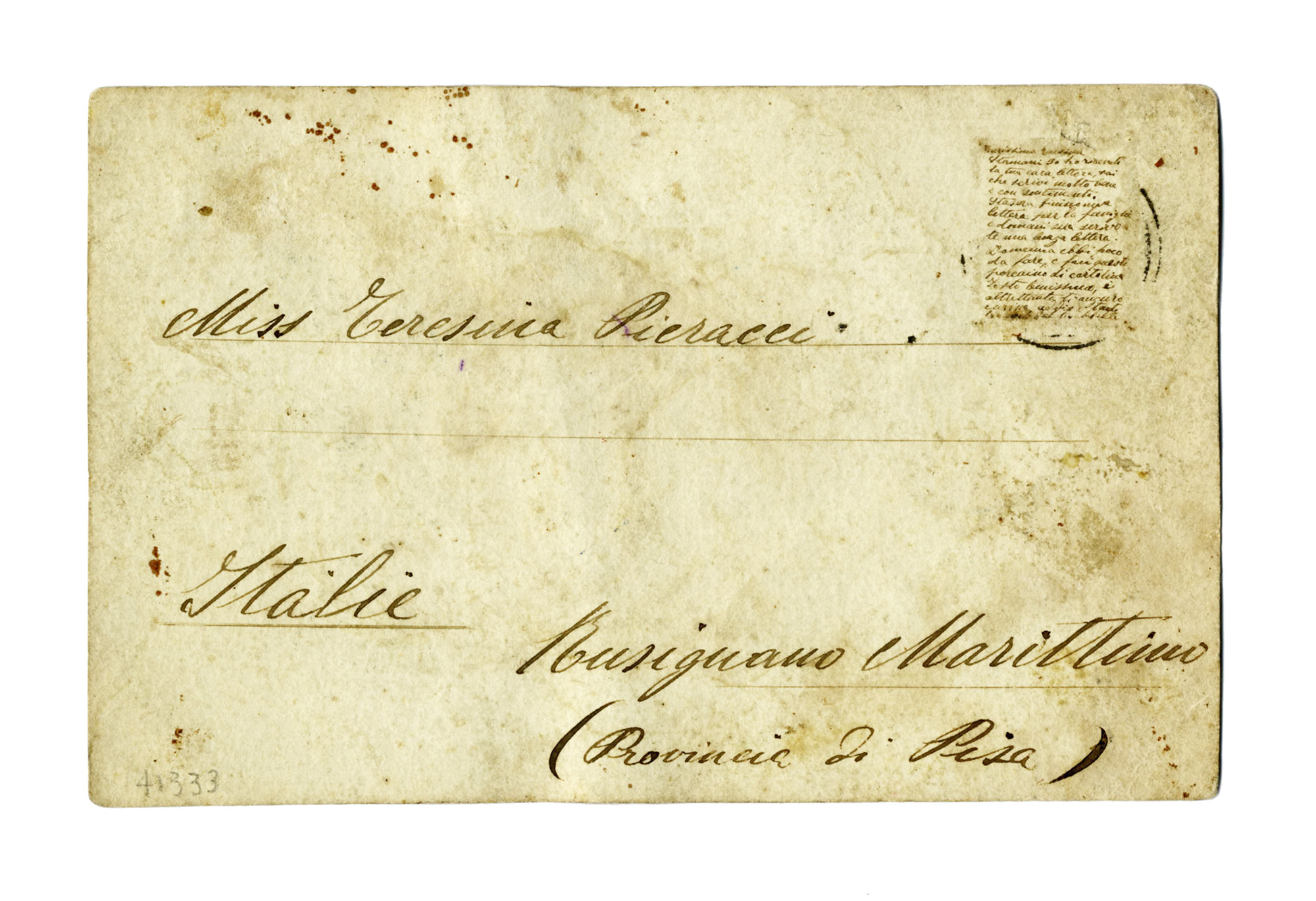 Cartolina fronte/retro completamente disegnata. mm 90x140. Firma in basso a sinistra e in basso a destra: "Tanti bacini, tuo Achille". Al verso, iscritto "Miss Teresina Pieracci, Italie, Rusignano Marittimo (Provincia di Pisa)" e, al posto del francobollo, iscritto a caratteri minuscoli il testo della cartolina. (1) Macchioline e difetti ma buona conservazione.