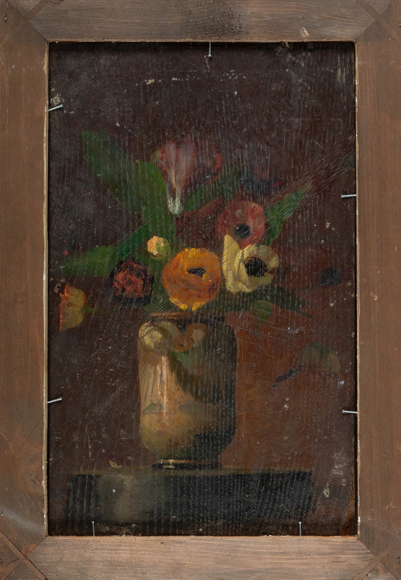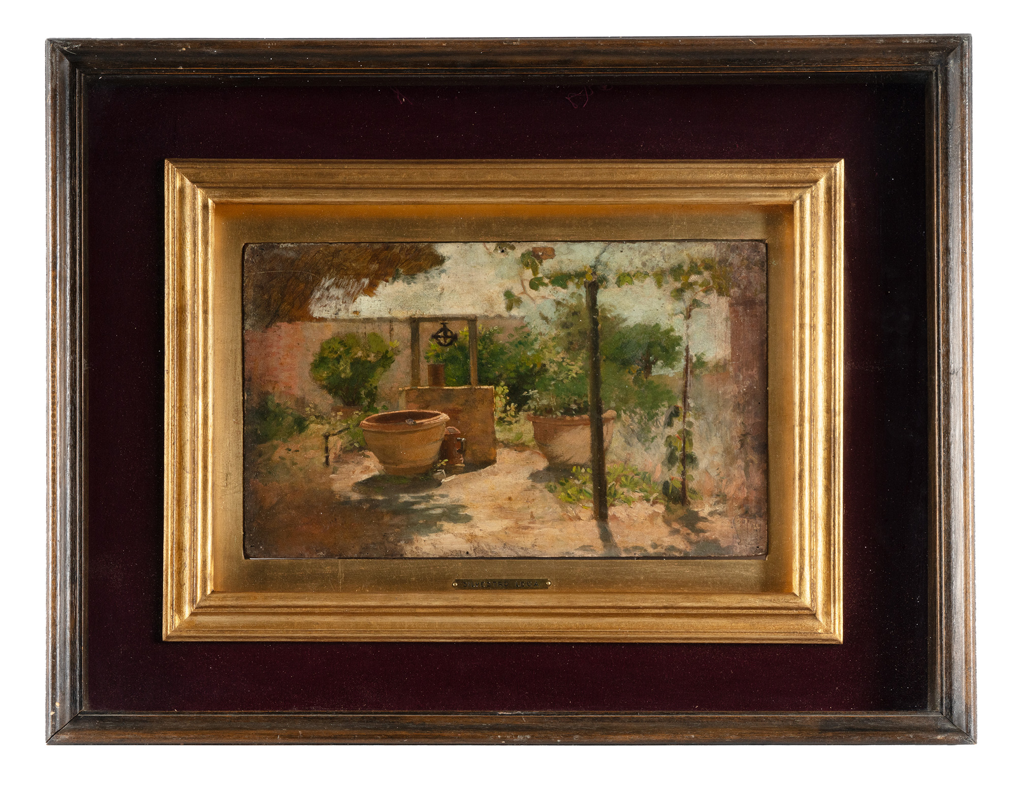 Olio su tavola. cm 24x38. Ulteriore olio al verso raffigurante un vaso di fiori. Targhetta metallica con iscritto "Silvestro Lega" in basso al centro della cornice. (1) In cornice lignea con vetro: cm 53x66. Alcuni forellini lungo i margini con graffi sparsi. Nel complesso buona conservazione.