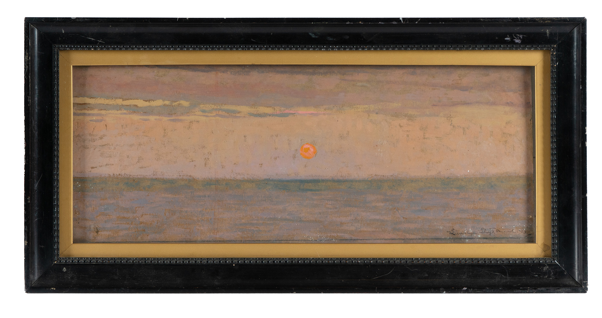 Olio su cartone. Firmato, titolato e datato a penna e inchiostro di china in basso a destra. Iscrizione a matita "Dono di Llewelyn Lloyd / Manarola 1903" su verso. Ulteriore iscrizione a penna e inchiostro di china "Indicato con il titolo: "Mare" nell'elenco di quadri dipinti da Ll. LLoyd sotto l'anno 1903 a pag. 144 del volume <<Tempi andati>> di Ll. Lloyd (Ediz. Vallecchi 1951)". (1) In cornice con vetro: cm 25,5x51. Brunitura diffusa con varie piccole ammaccature sparse. Buona conservazione.