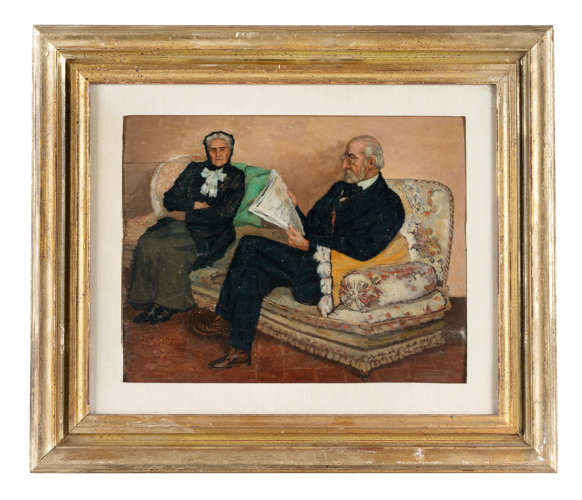 Olio su tavola. cm 35,8x43,8. Firma e iscrizione "Ritratti dei M.si B. Salimbeni / dip. in Gello nella loro villa / l'anno 1914" a inchiostro di china nero sul verso. Coppia di parziali timbri a cera-lacca nera posti al verso, sotto l'etichetta a stampa contenente i dati dell'opera. Ulteriori accenni di schizzi sul verso della tavola. (1) In cornice con vetro: cm 57x67. Pochi piccoli fori di tarlo al margine destro, una venatura del legno sbalzata al margine sinistro. Nel complesso buono stato conservativo.