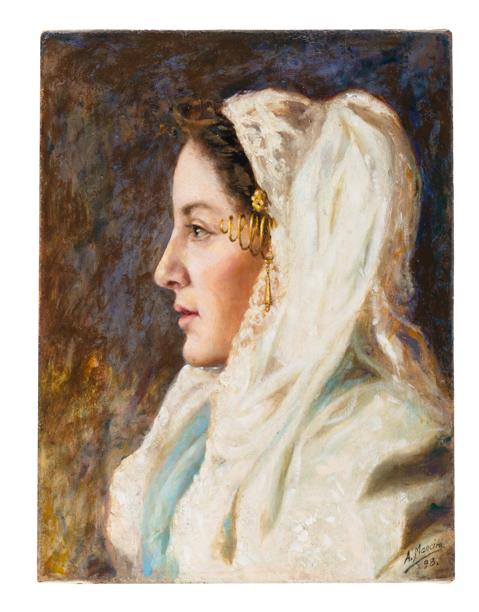 Olio su tela. cm 41x30,7. Firma e data a penna e inchiostro di china in basso a destra. Opera di alta qualità pittorica in cui la minuzia della resa del volto e della spilla è sottolineata ancor più dalla resa pittorica del velo che circonda il viso stesso, scolpito a tocchi di luce. (1) Buona conservazione.
