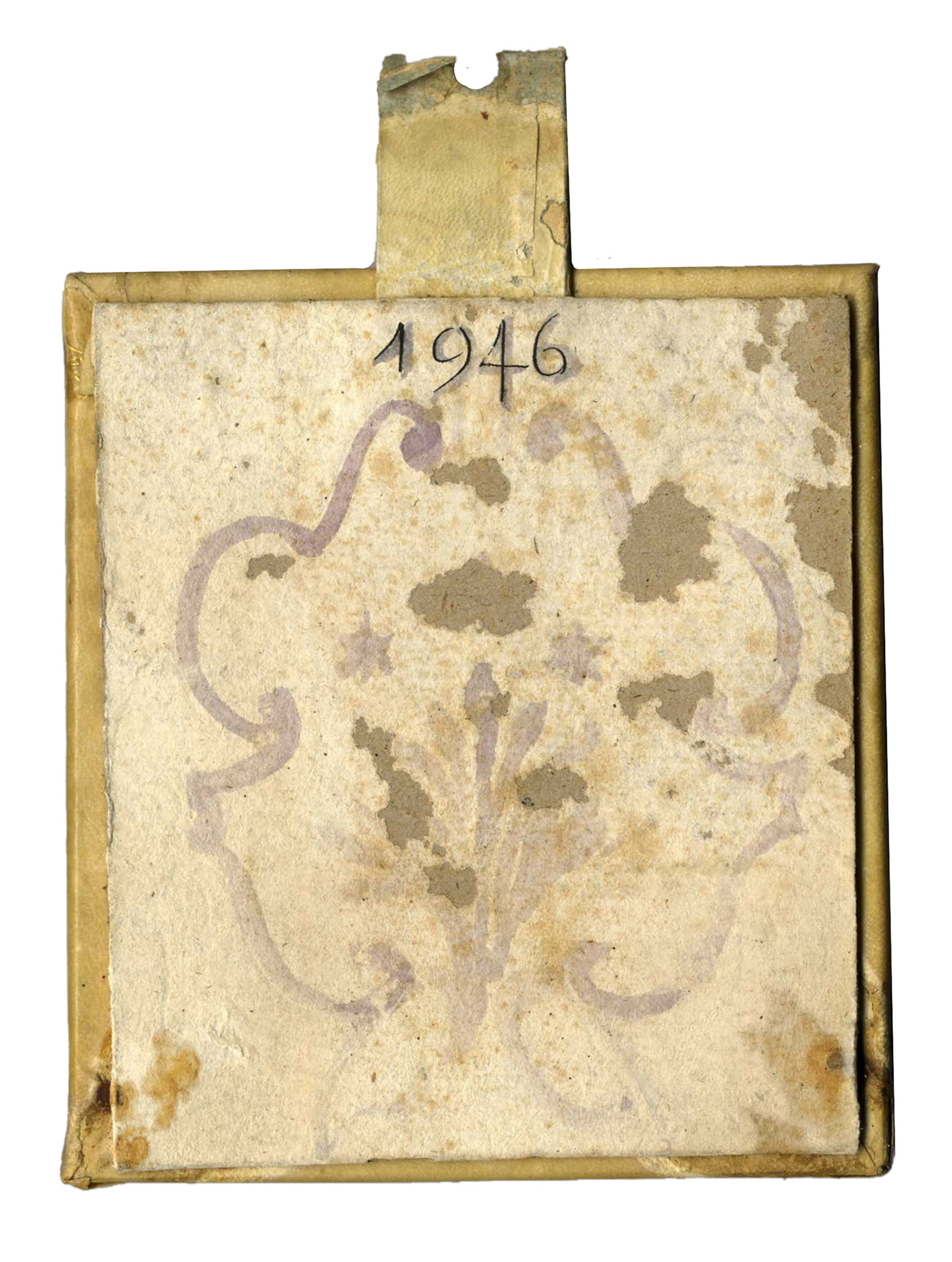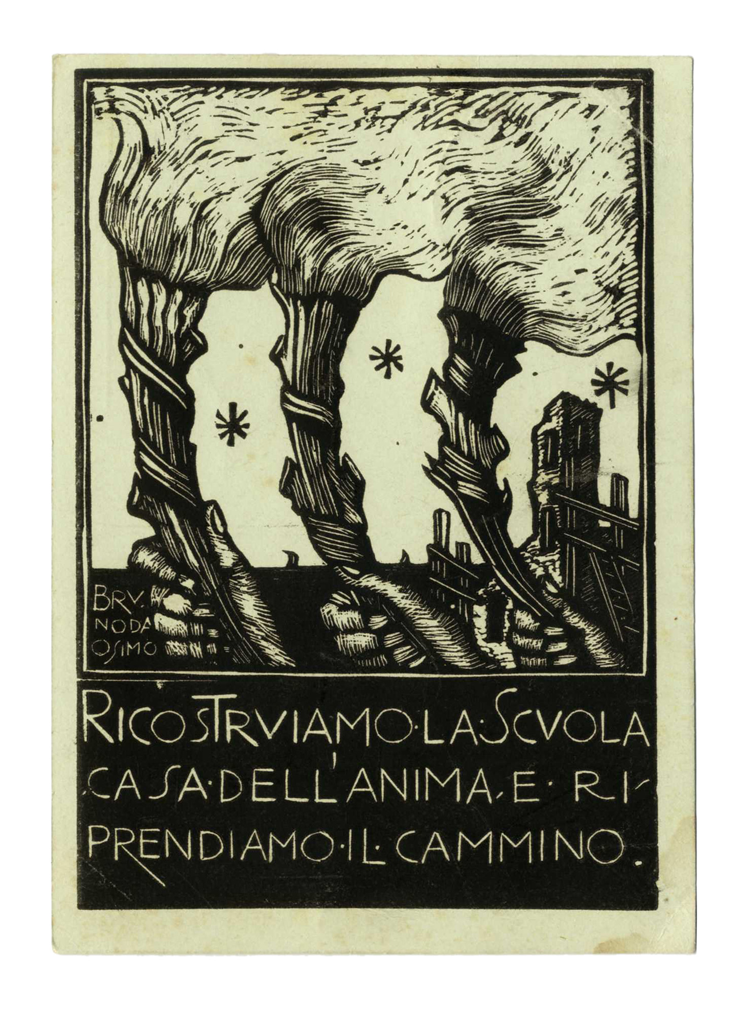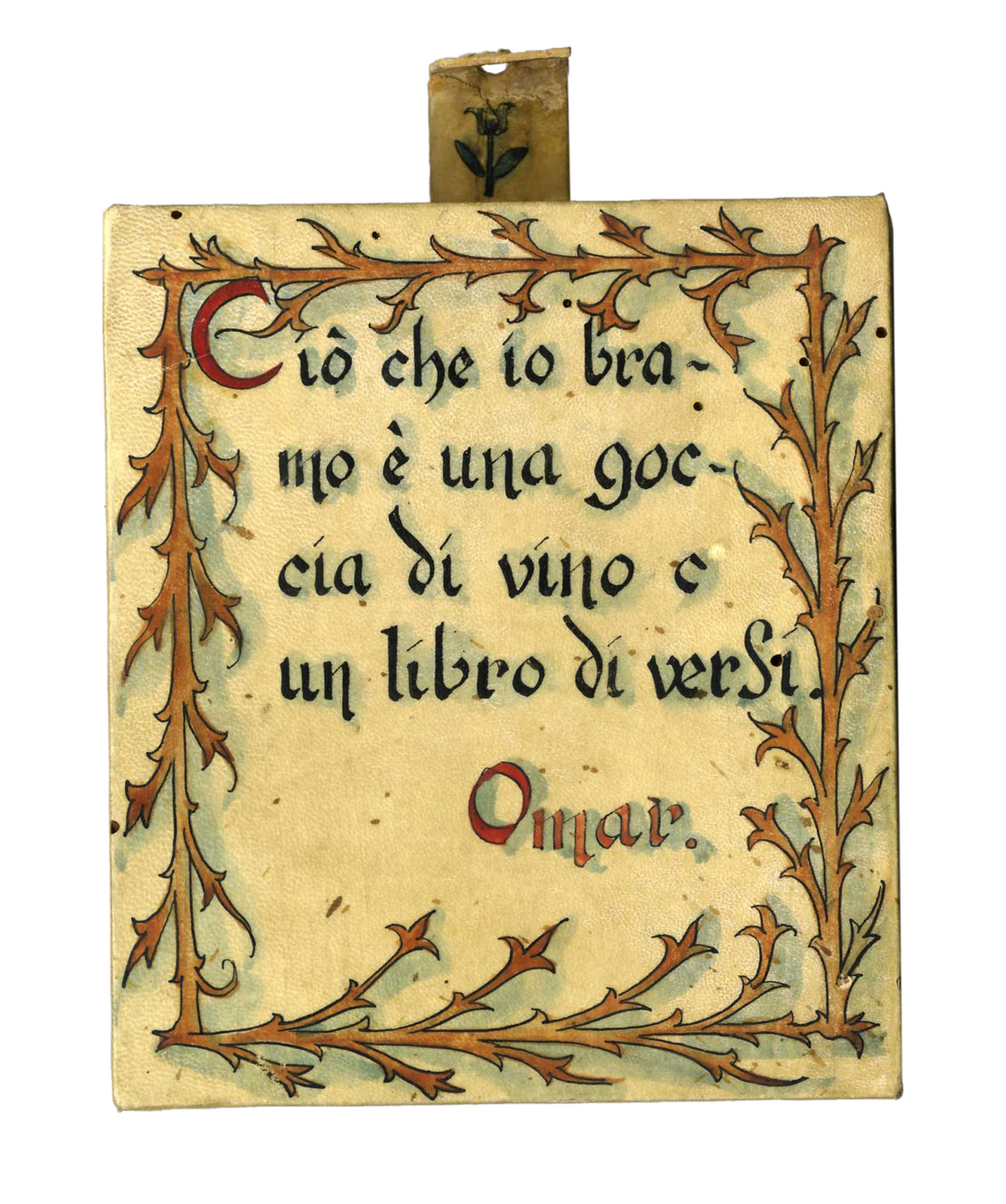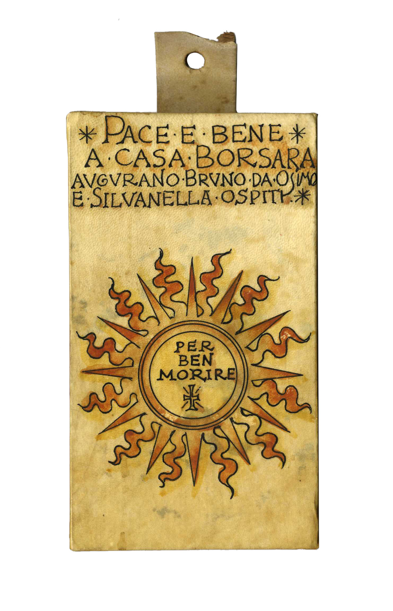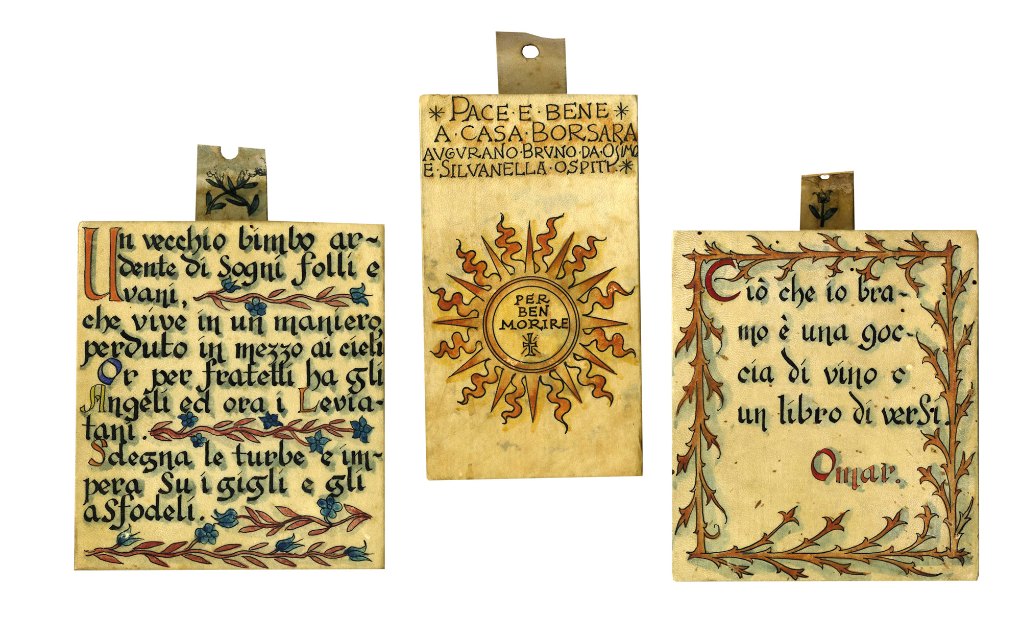 Raccolta di 3 graziosi acquerelli e penne e inchiostro di china nero su pergamena applicata a piccoli blocchi di legno. Opere realizzate per offrire le proprie condoglianze a Guido da Borsare dopo un lutto familiare. Compongono il lotto: 1) Per ben morire. Iscrizione "Pace • e • bene • a • casa • Borsara • Augurano • Bruno • Da • Osimo • e • Silvanella • ospiti" al margine superiore. 2) Ciò che io bramo è una goccia di vino e un libro di versi. Al verso: carta greve applicata con iscrizione "A • Guido • da • Borsara • per • la • fraternità • che • ci • lega • alla • divina • POESIA" con firma e data apposti poco sotto. Controfirma sul fondo dell'oggetto. 3) Un vecchio bimbo ardente di sogni folli e vani, che vive in un maniero perduto in mezzo ai cieli. Or per fratelli ha gli Angeli ed ora i Leviatani. Sdegna le turbe e impera Su i gigli e gli asfodeli. Datato al verso. Firmato sul fondo, sotto l'iscrizione "Mio • cuore • ho • trascritto • questi • tuoi • cari • versi • io". Ogni cubo presenta ricchi decori floreali sui lati e linguette per affissione sulla cima. SI AGGIUNGE: Da Osimo B., Cartolina xilografica viaggiata per Guido da Borsara. mm 150x105. (4) Le pergamene risultano lievemente brunite. Le carte applicate al verso hanno piccole macchioline in vicinanza dei chiodi di supporto. Le linguette da affissione con qualche mancanza. Buona conservazione generale.