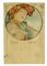 Matita, acquerello e china su carta sagomata circolare applicata a carta di supporto. mm 140x90. "DOPISNICE" (cartolina) iscritto a matita sul verso del supporto sopra l'iscrizione "X. V. 1909". Probabile studio progettuale per cartolina postale. Ottima mano nell'esecuzione del soggetto centrale. Il foglio circolare è applicato e circondato da elaborate cornici dal sapore liberty e piccoli cuori al margine inferiore. Anche se priva di firma, questa bella illustrazione racchiude molti elementi distintivi di Mucha: soggetto, elaboratissimi abiti con pattern misti e merletti, ombreggiature acquerellate e contorni fortemente marcati a china per delineare la silhouette della figura. (1) Brunitura sulla carta di supporto con piccolo gruppo di macchioline in basso a sinistra. Tracce d'uso lievi al verso. Buona conservazione generale.