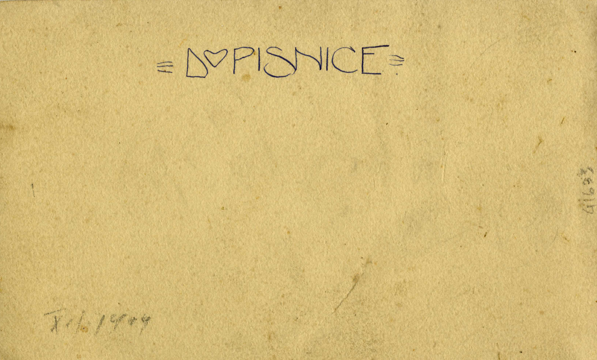Matita, acquerello e china su carta sagomata circolare applicata a carta di supporto. mm 140x90. "DOPISNICE" (cartolina) iscritto a matita sul verso del supporto sopra l'iscrizione "X. V. 1909". Probabile studio progettuale per cartolina postale. Ottima mano nell'esecuzione del soggetto centrale. Il foglio circolare è applicato e circondato da elaborate cornici dal sapore liberty e piccoli cuori al margine inferiore. Anche se priva di firma, questa bella illustrazione racchiude molti elementi distintivi di Mucha: soggetto, elaboratissimi abiti con pattern misti e merletti, ombreggiature acquerellate e contorni fortemente marcati a china per delineare la silhouette della figura. (1) Leggera brunitura generale con macchioline al margine inferiore. Verso con minimi difetti. Buona conservazione generale.