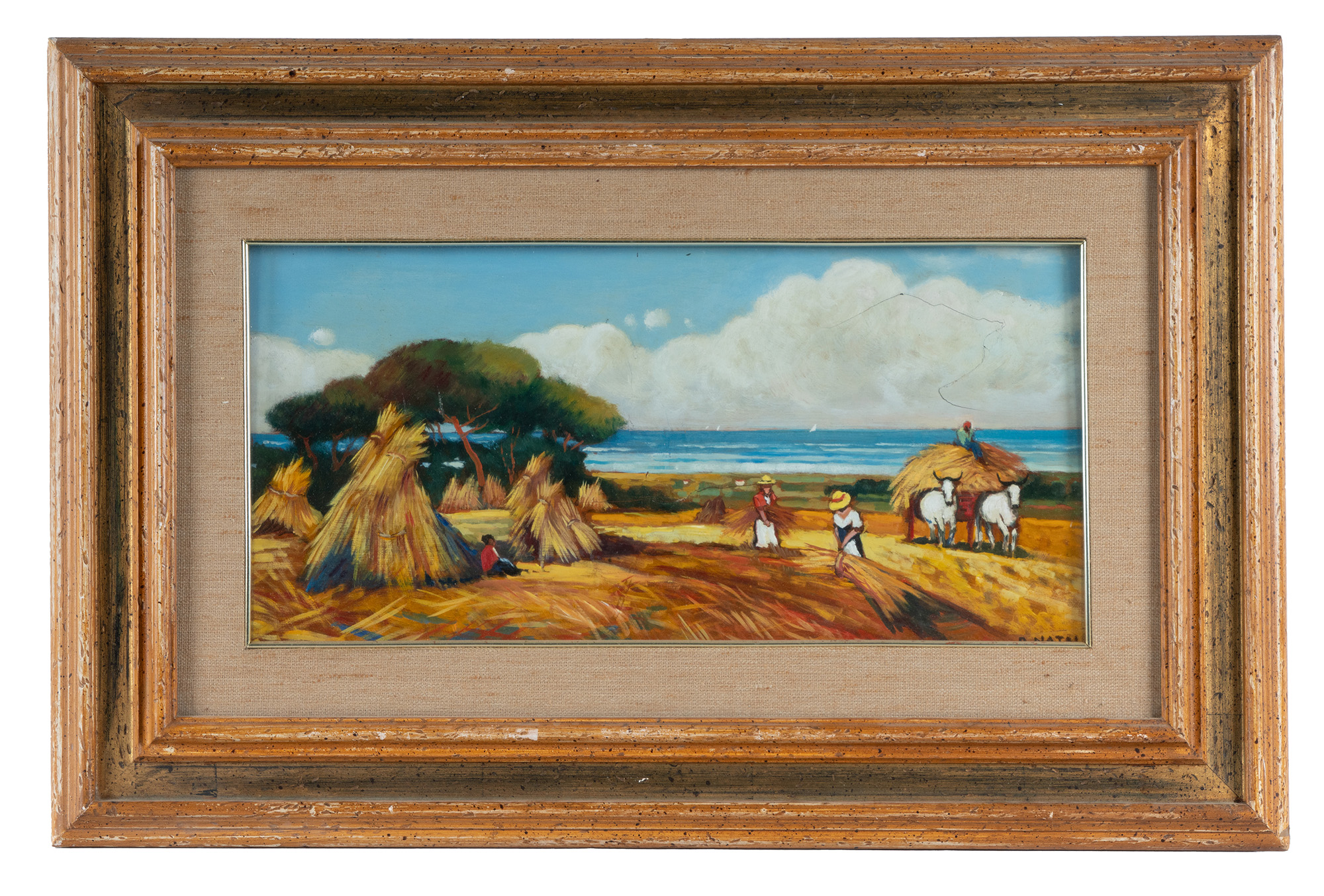 Renato Natali, Mietitura. 1948. Olio su tavola. cm 24,5x52,5. Firma in basso...