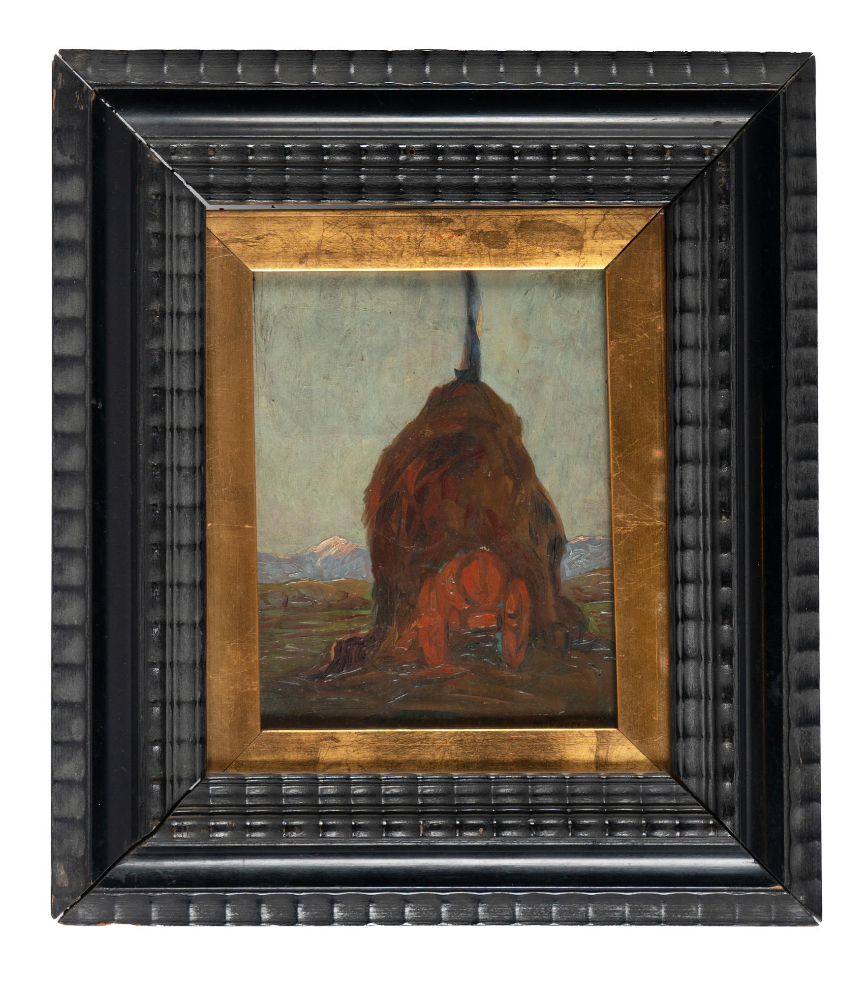 Mario Puccini, Carro con pagliaio. Olio su tavoletta. cm 23,1x18. Firmato in...