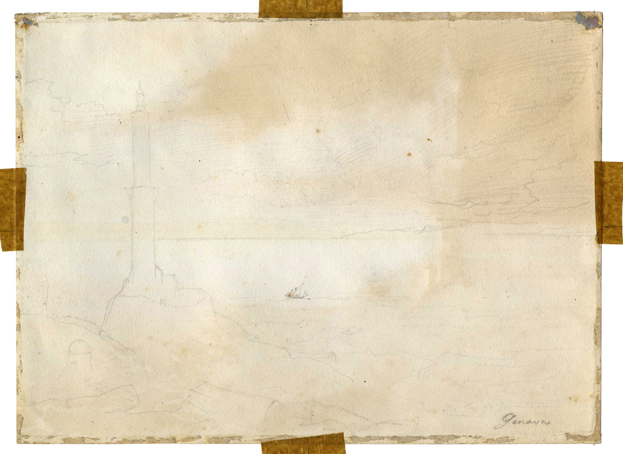 Matita e acquerello su carta. mm 258x345. Titolo e probabile accenno di firma poco leggibile al verso, dove è presente un ulteriore schizzo compositivo della stessa veduta. Il dipinto finale ad olio Leuchtturm von Genua del 1826, pubblicato nel catalogo Carl Rottmann - Landschaft als Geschichte, 1998, a cura di Christoph Heilmann e Erika Rödiger-Driuf, è oggi esposto al Kurpfälzisches Museum di Heidelberg. (1) Foglio applicato a passe-partout. Buona conservazione generale.