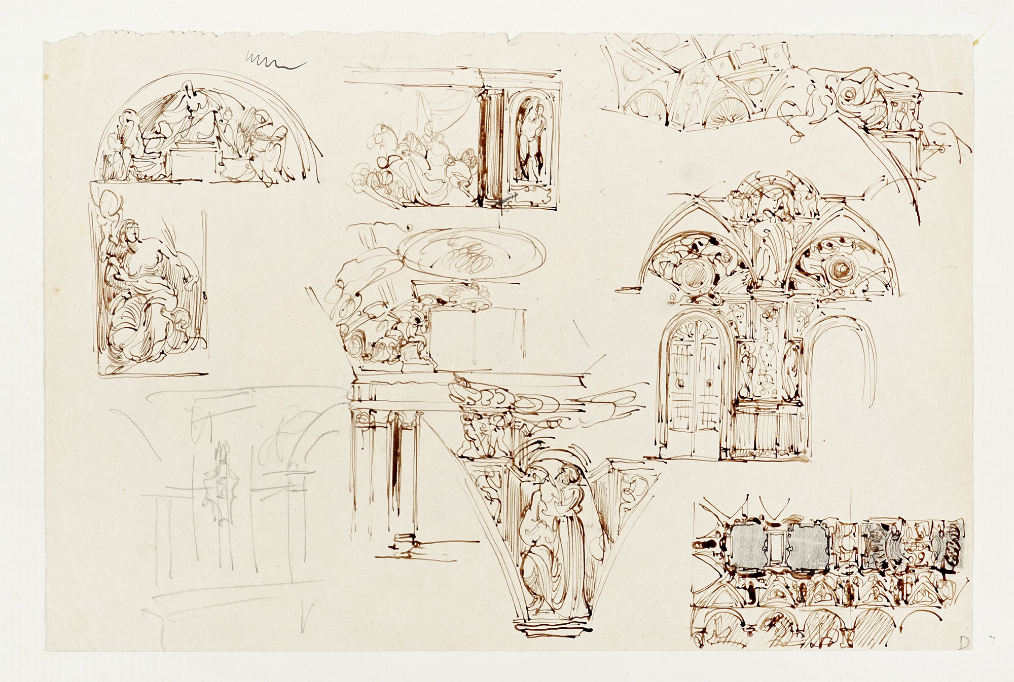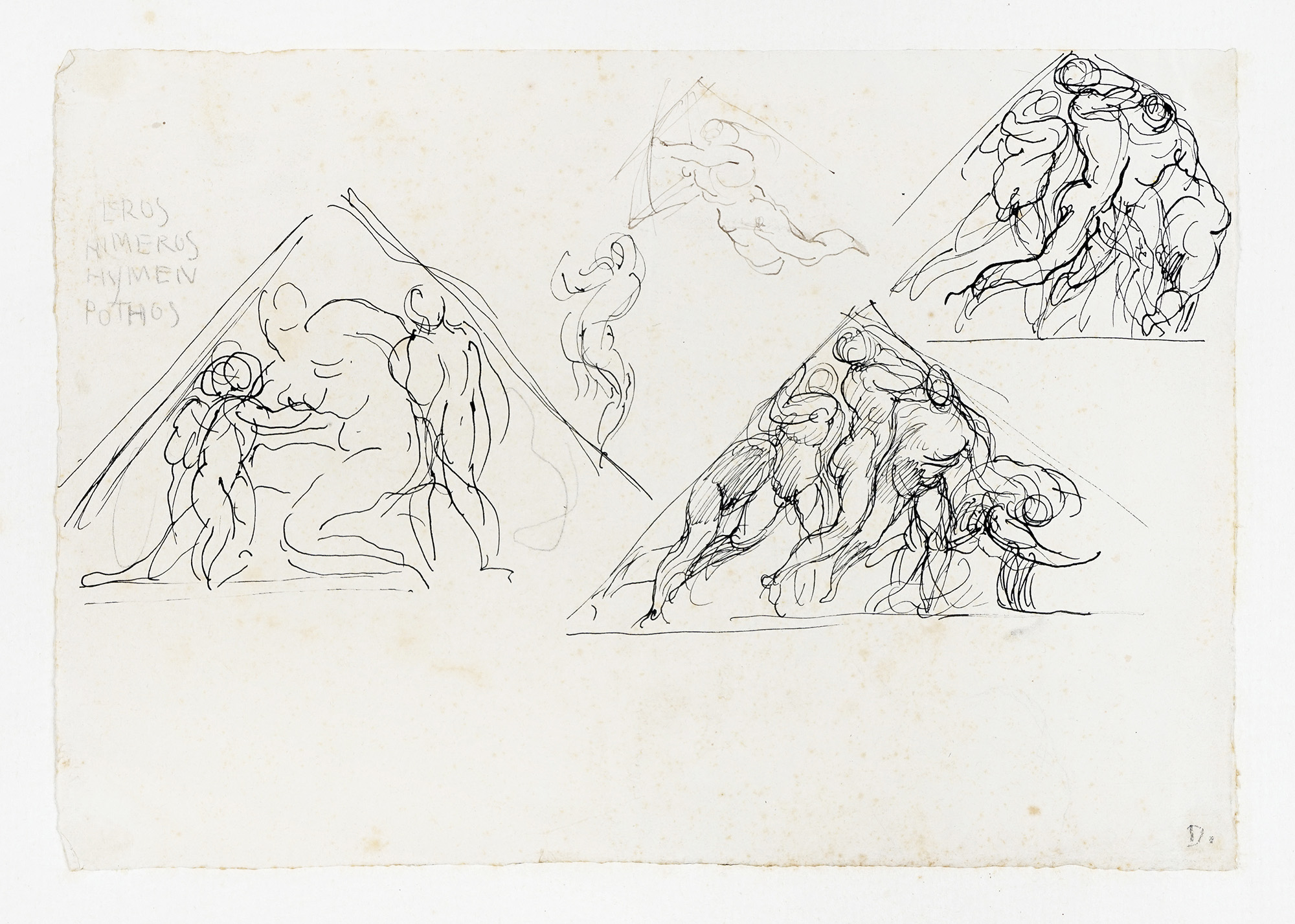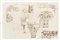 Raccolta di 4 penne e inchiostri di china bruni, acquerelli e matite su carta. mm 105/210x255/315. Una siglata in basso a destra. Provenienza: Eredi De Carolis. (4) Ogni foglio è applicato a carta di supporto. Minimi difetti lungo i margini, altrimenti buona conservazione complessiva.