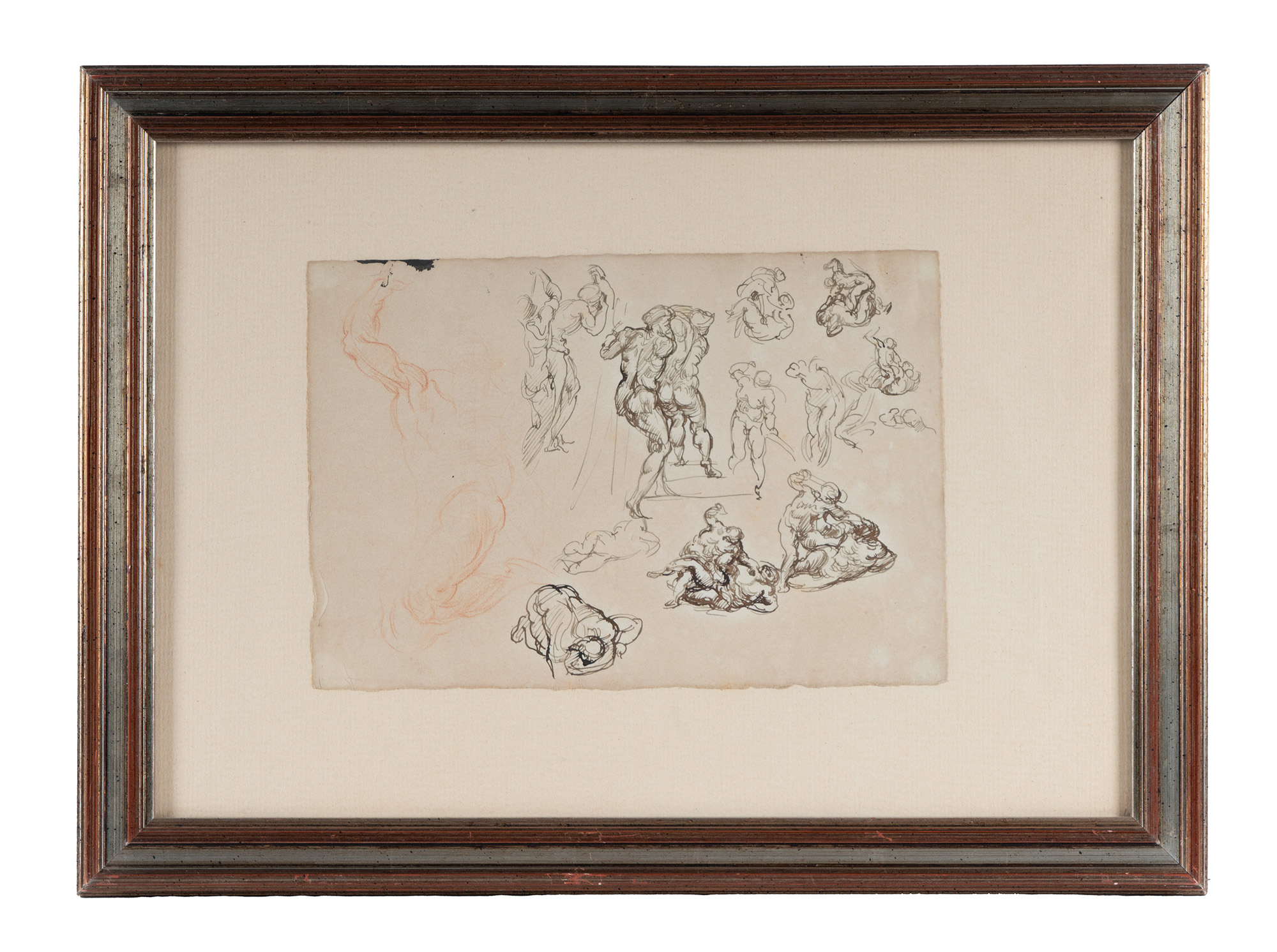 Penna e inchiostro di china bruno e sanguigna su carta filigranata. mm 210x315. (1) In cornice con vetro: cm 41,5x57. Foglio applicato a carta di supporto. Leggerissima brunitura con lievi difetti lungo i margini. Buona conservazione generale.