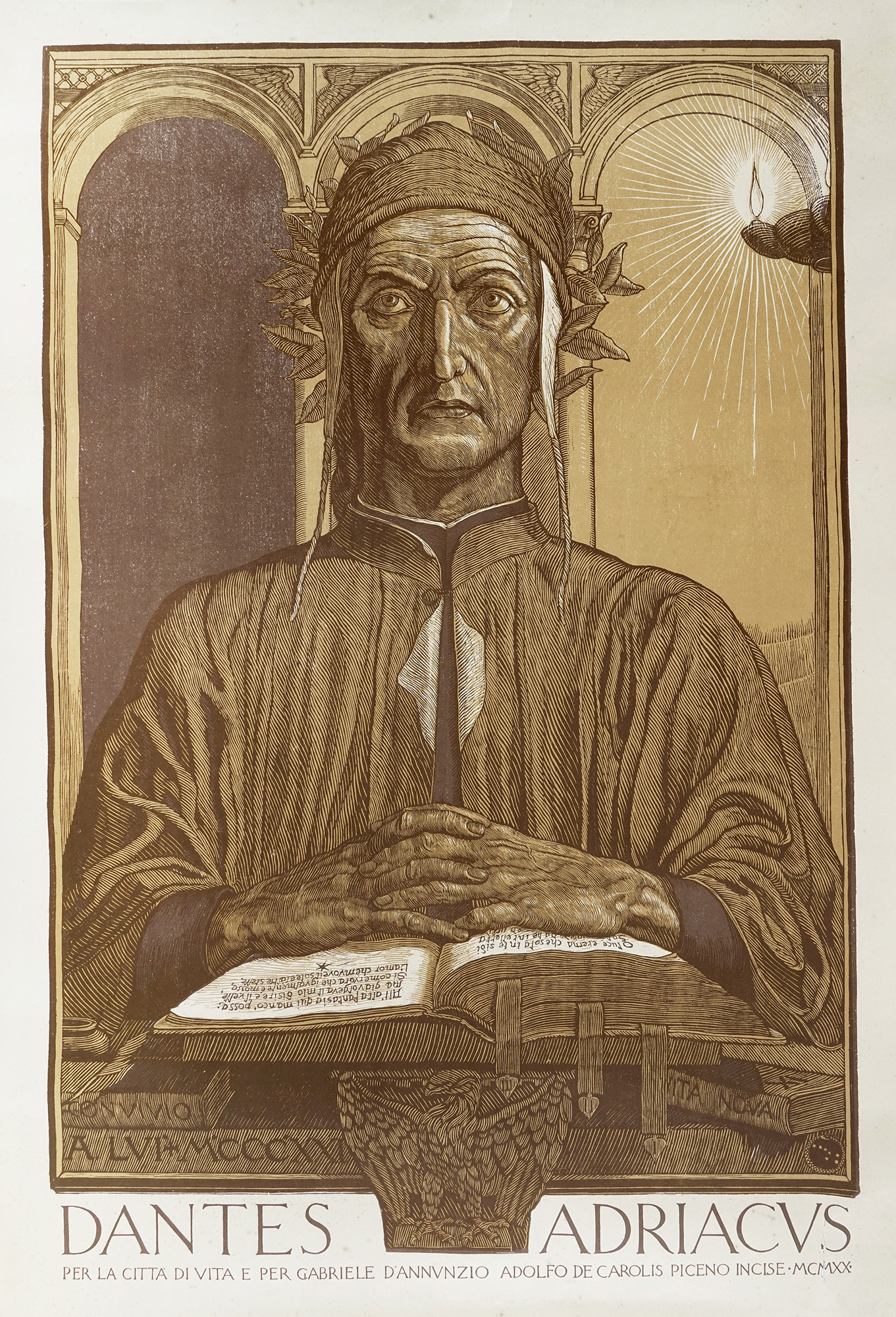 Xilografia a due legni. mm 570x400. Foglio: mm 1000x700. CONTI, 1929, tav. II. ORANO-DI MARZIO, 1929, p. 5. Iscrizioni: "A lui MCCCXXI - Adolfo De Carolis incise MCMXX". Realizzata per il sesto centenario della morte di Dante, ne esistono due versioni, una titolata Dante Alighieri e una Dante Adriacus. La seconda versione modificata fu voluta da D'Annunzio. Dante è raffigurato frontalmente, a mezzo busto, con lo sguardo fisso davanti a sé e il capo cinto d'alloro, dopo aver concluso la stesura della Divina Commedia. Le mani sono incrociate sopra agli ultimi versi della Terza Cantica. In primo piano, sullo scrittoio, sono collocati altri due libri: il Convivio, alla destra del poeta, e la Vita Nova, alla sua sinistra. Sullo sfondo, tre arcate chiudono la scena a simboleggiare le tre cantiche: quella di sinistra, immersa nel buio, rappresenta l'Inferno, quella centrale, coperta dal volto del poeta, il Purgatorio, e quella di destra, imbevuta di luce e con una lucerna accesa (simbolo della Sapienza), il Paradiso. (1) Foglio brunito. Mancanze e strappetti marginali con fioriture sparse. Uno degli strappi interessa largamente l'inciso al margine inferiore destro, altrimenti impressione in buono stato conservativo.