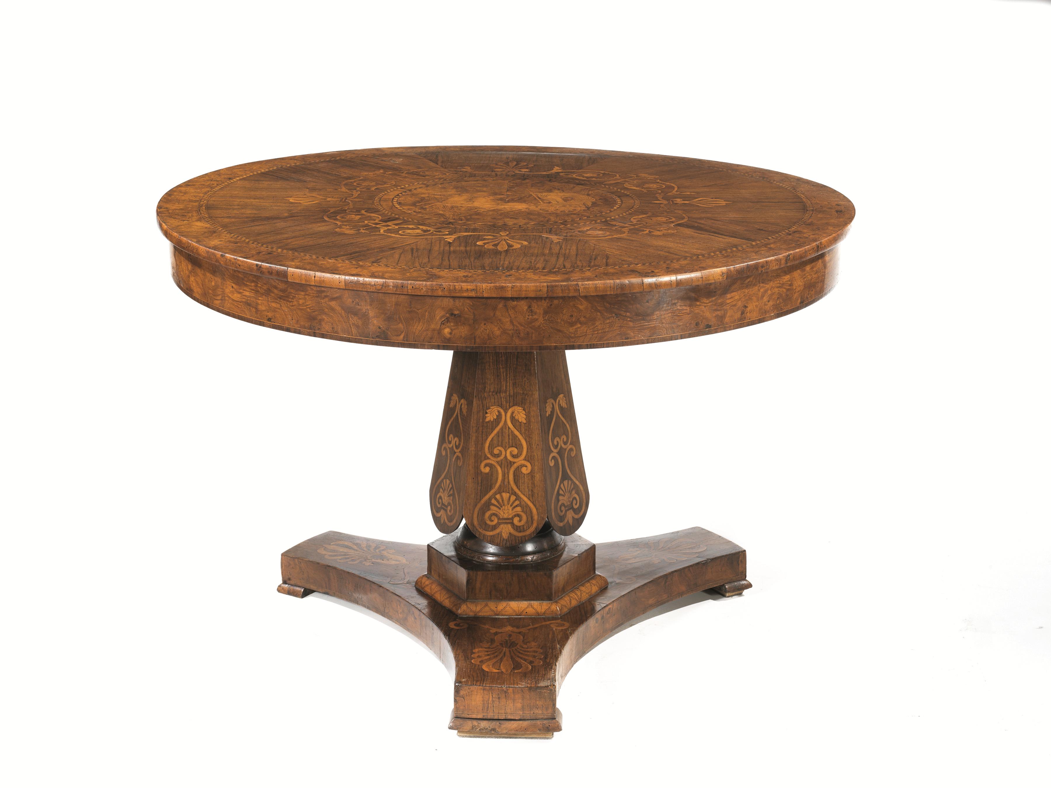 Grande tavolo da centro, Rolo, ebanista Alfonso Mari, metà sec. XIX, in noce e radica intarsiati, piano circolare centrato da grande medaglione con Apollo in nudità eroica alla guida del carro del sole inquadrato tra volute di foglie di acanto e palmette, fusto a balaustro sfaccettato su base tripode decorata da grandi palmette aperte a ventaglio, diam. cm 116, alt. cm 77, corredato di poesia autografa dell'ebanista Alfonso Mari l'anno 1864