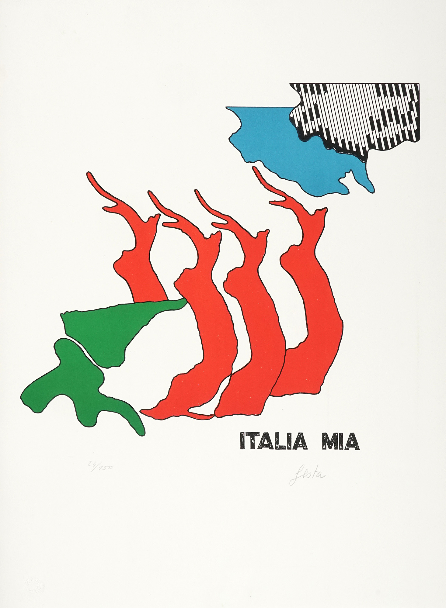 1) Dedicato a. Litografia. mm 457x420. Foglio: mm 700x500. Firma a matita in basso a destra e tiratura in basso a sinistra. Es. 38/150. 2) Italia mia. Litografia. mm 405x440. Foglio: mm 700x500. Firma a matita in basso a destra e tiratura in basso a sinistra. Es. 24/150. (2) Italia mia presenta una macchia in basso a destra.