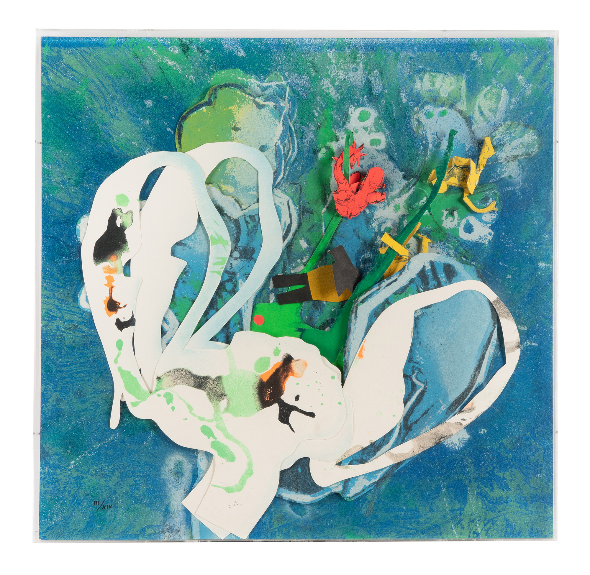 Multiplo su carta applicato su tavola in teca di plexiglass. cm 70,5x70,5. Firma, timbro a secco e tiratura in basso a sinistra. Opera accompagnata dal certificato di autenticità di San Zanobi. Es. III/XIV. (1) La teca presenta qualche scheggiatura mentre l'opera è in ottimo stato conservativo.