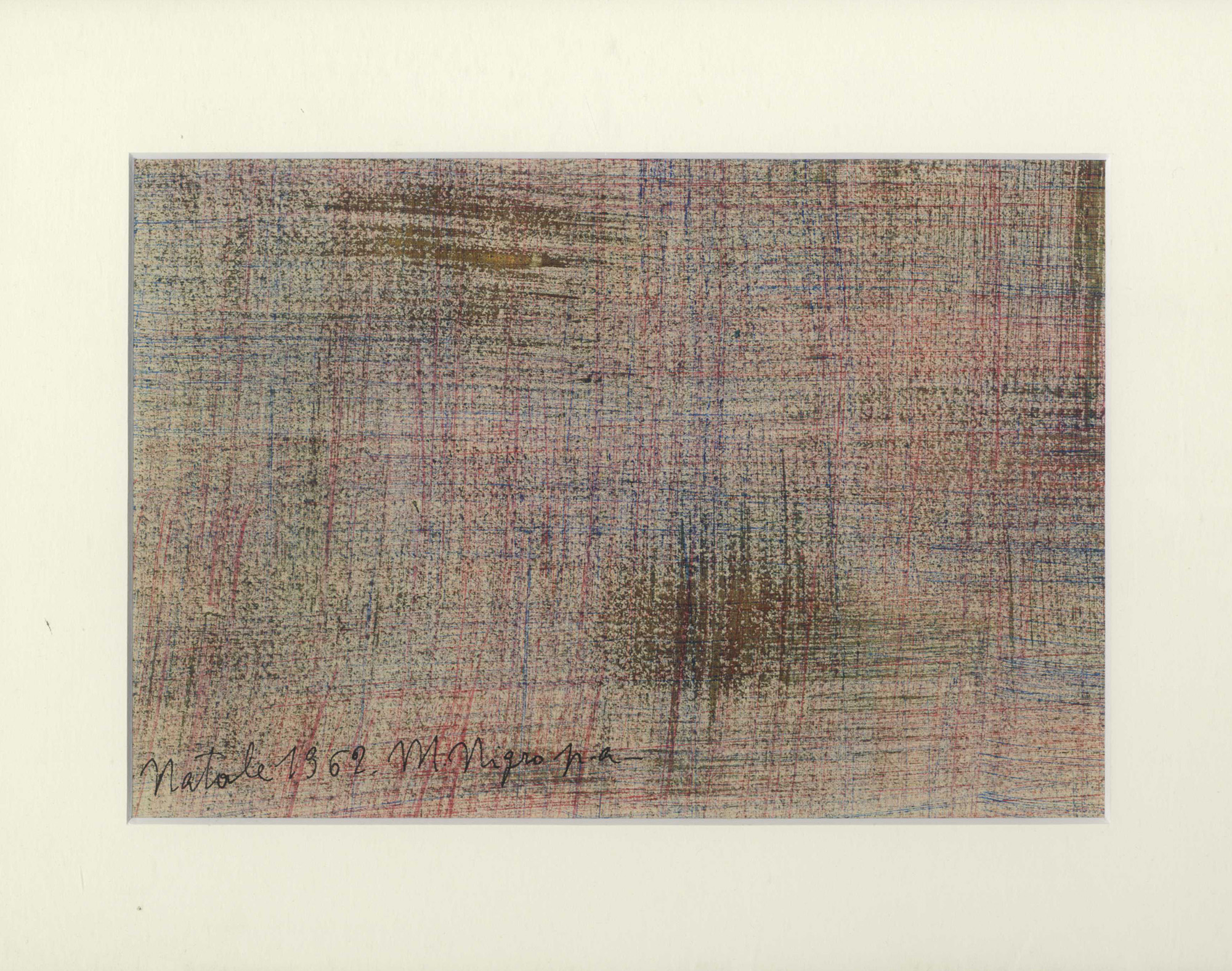 Tecnica mista su cartone. cm 18,6x25,7. Iscritto, in basso a sinistra: "Natale 1962. M. Nigro. p.a." Esemplare del tutto simile, come tecnica e soggetto, ad altri tre passati in asta: quello passato da Farsetti nel 1999 e che riportava la stessa iscrizione, quello passato in asta da Meeting Arte nel 2012 e titolato V. metro 6 e quello passato in asta sia da Il Ponte nel 2013 che da Studio d'Arte Borromeo nel 2018. (1) Opera applicata completamente a passe-partout e poi in cornice nera con qualche difetto: cm 25,8x32,8. Ottima conservazione.