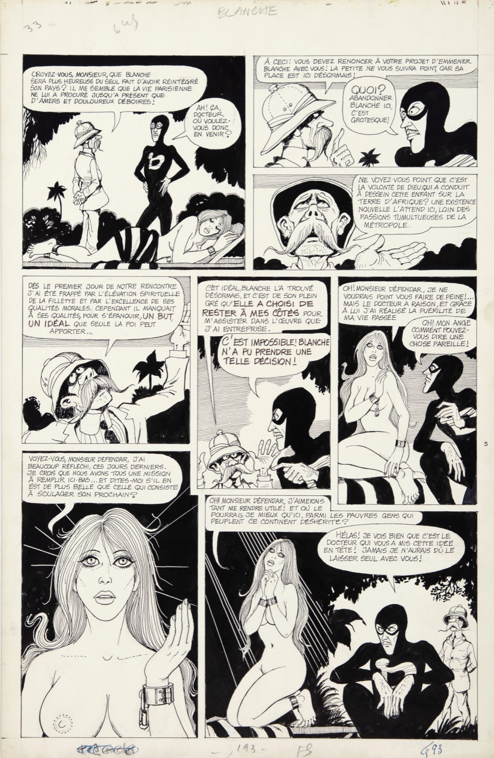 Tavola originale realizzata da Pichard per "Blanche Épiphanie", pubblicata a pag. 33 del secondo capitolo della saga omonima da Les Éditions du Fromage nel 1976. Creata da Pichard e Lob tra il 1972 e il 1987, le tribolazioni di Blanche Épiphanie sono tra le avventure più incredibili nel pantheon dei fumetti per adulti. La giovane e formosa Blanche viaggia per il mondo suo malgrado, cercando di proteggere la sua virtù. Tormentata dal perfido banchiere Adolfo e da una miriade di altri cattivi, invidiata da Morena, salvata dal ciclista Défendar, eroe mascherato e incappucciato ma di una goffaggine smisurata, la ritroviamo tra Africa e America nella Belle Époque.