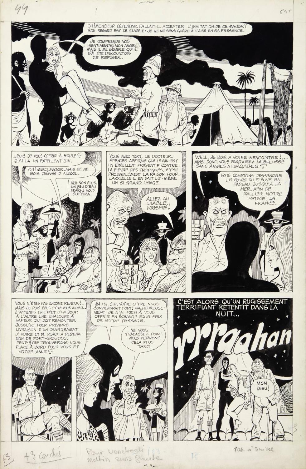 Tavola originale realizzata da Pichard per "Blanche Épiphanie", pubblicata a pag. 44 del secondo capitolo della saga omonima da Les Éditions du Fromage nel 1976. Creata da Pichard e Lob tra il 1972 e il 1987, le tribolazioni di Blanche Épiphanie sono tra le avventure più incredibili nel pantheon dei fumetti per adulti. La giovane e formosa Blanche viaggia per il mondo suo malgrado, cercando di proteggere la sua virtù. Tormentata dal perfido banchiere Adolfo e da una miriade di altri cattivi, invidiata da Morena, salvata dal ciclista Défendar, eroe mascherato e incappucciato ma di una goffaggine smisurata, la ritroviamo tra Africa e America nella Belle Époque.