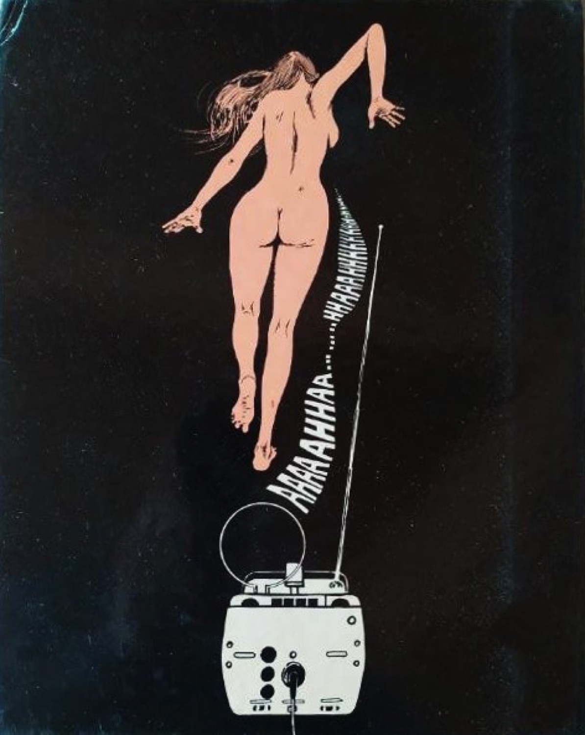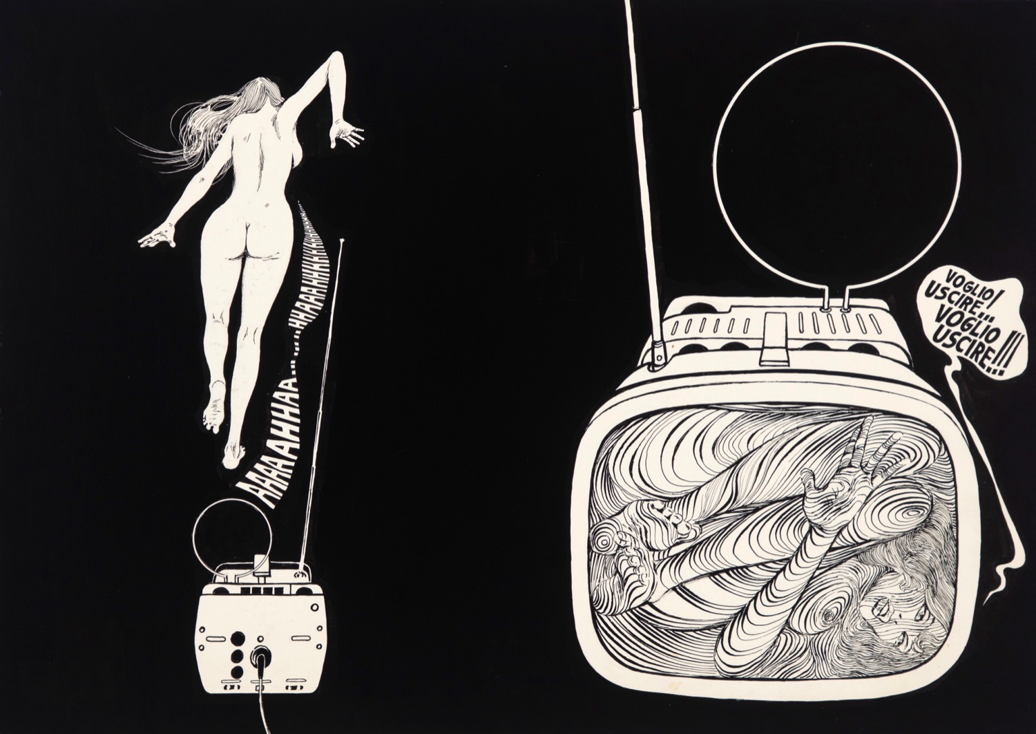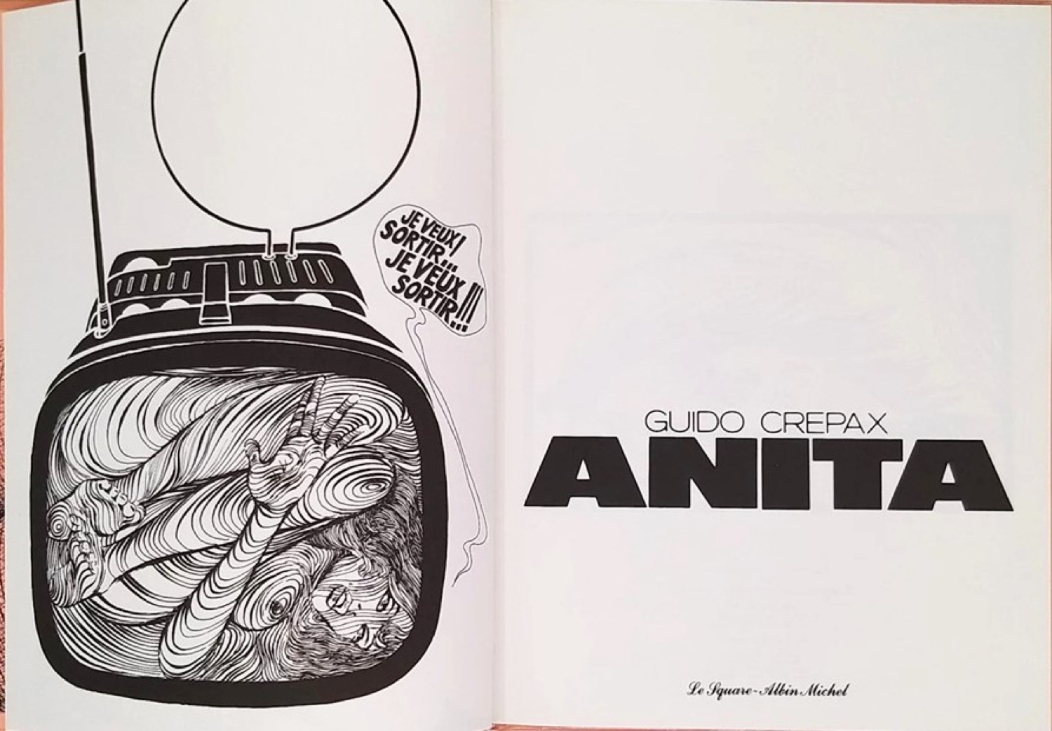 Originale di copertina (e quarta di copertina) realizzato da Crepax per "Anita: Una storia possibile", volume pubblicato dalle Edizioni Morgan nel 1974. Un capolavoro del maestro milanese, un'immagine che ha segnato un'epoca: l'esordio della dolce e bionda Anita (ispirata ad Anita Ekberg), protagonista di un'impressionante storia onirica in cui la dipendenza dalla televisione e dai suoi programmi portano la donna ad avere un vero e proprio rapporto sessuale con la TV, anticipando di dieci anni alcune scene del delirante film di culto "Videodrome" di Cronenberg.