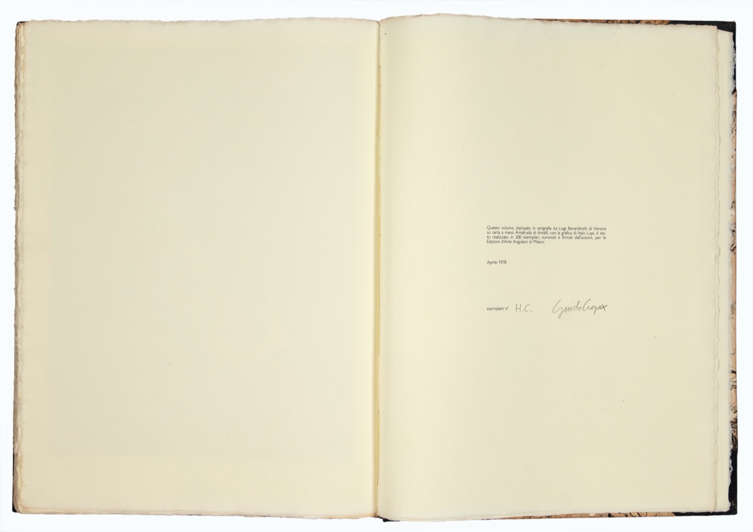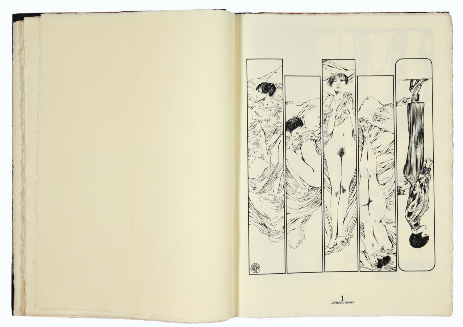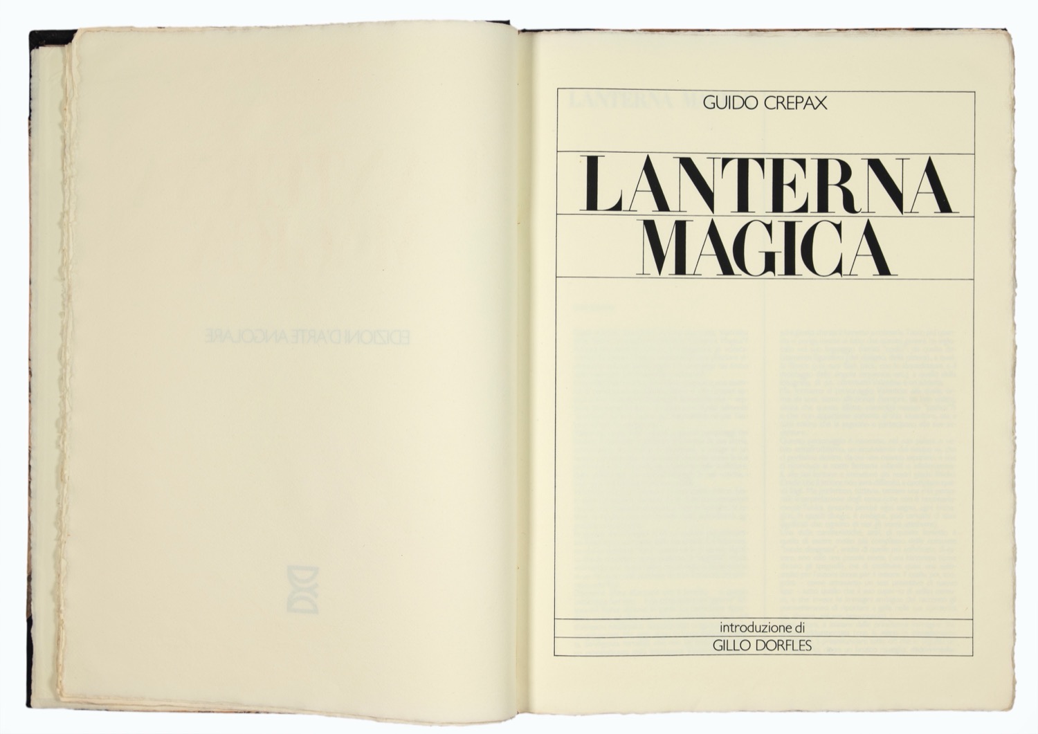 Libro in edizione di lusso "Lanterna magica" di Guido Crepax, stampato in serigrafia da Luigi Berardinelli di Verona su carta a mano con barbe Amatruda di Amalfi con la grafica di Italo Lupi, tirato in soli 300 esemplari numerati e firmati dall'artista (nostro esemplare H.C. Hors Commerce / Fuori Commercio), per le Edizioni d'Arte Angolare di Milano nel 1978. Volume in ottimo stato con piccole abrasioni e ammaccature. Presente il raro cofanetto editoriale con mancanze e difetti. Firmato e numerato a matita da Crepax.