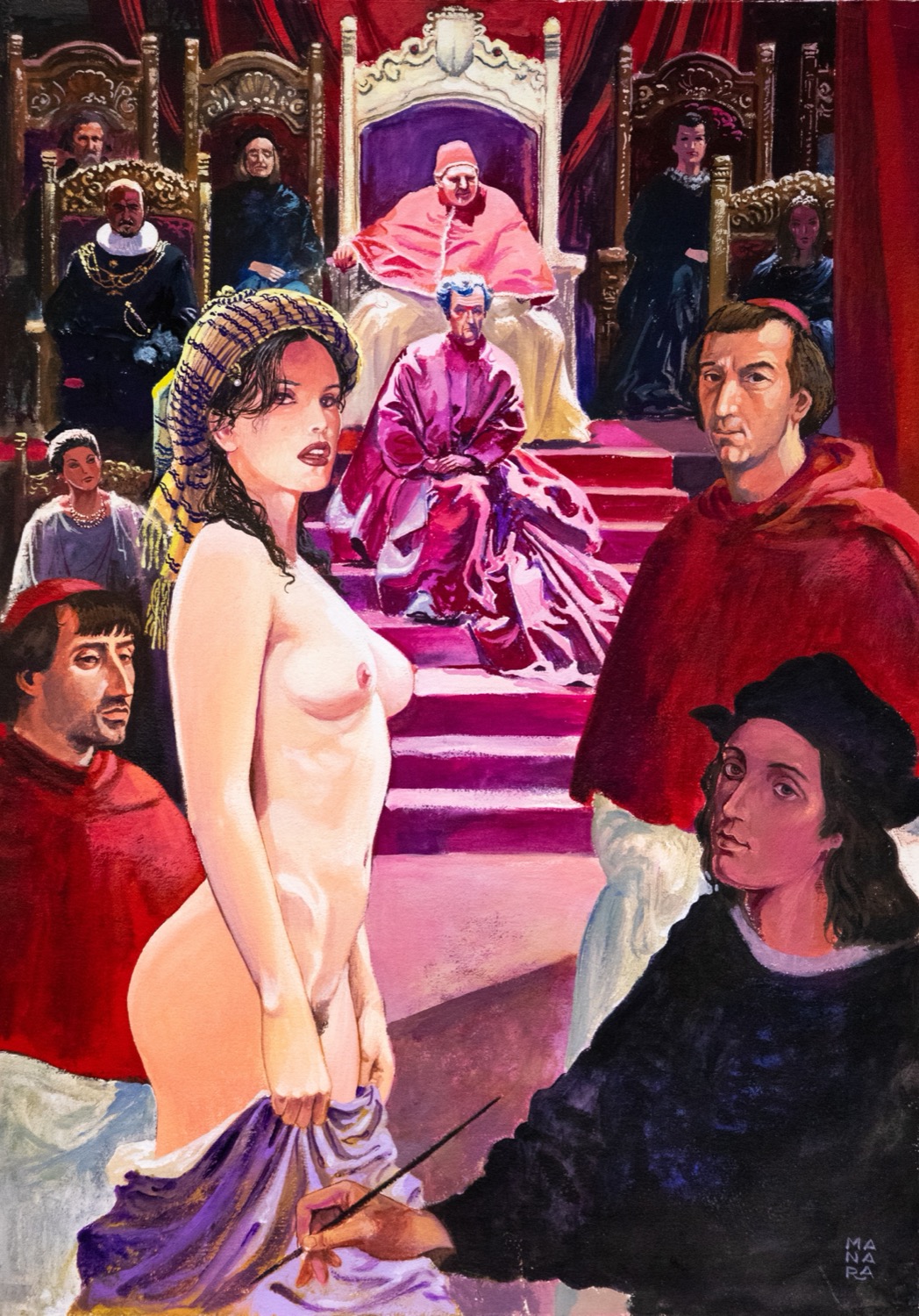 Dipinto originale realizzato da Manara e pubblicato per la prima volta in Francia sul volume "La modèle" edito da Albin Michel nel 2001, successivamente in Italia su "Il pittore e la modella" da Mondadori nel 2002 e recentemente utilizzato come copertina del volume "Milo Manara Collection: I Borgia" (vol. 2) dall'editore RCS nel 2024. Una delle opere più originali e sentite del maestro veronese, ideata sul rapporto tra il pittore (nella storia dell‘arte) e la figura della "modella". " Tra i libri più belli disegnati da Milo Manara, quello che palesa il suo amore e la grande conoscenza della storia dell'arte e ci mostra l'arte come una lunga storia segnata da quest'intimo e segreto legame tra il pittore e la sua modella. Manara ci mostra il desiderio, l'aspetto gioioso e vitale della pittura, l'impulso naturale e l'aspetto perturbante nel nudo nei sogni personali dell'artista che interpreta e segna, amando e compomettendo la propria mano nella delineazione della figura. Da Prassitele all'arte pompeiana fino ad arrivare al Novecento una lunga carrellata di volti e di forme. " (Vincenzo Mollica) Lieve piega all'angolo superiore destro. Firmato.