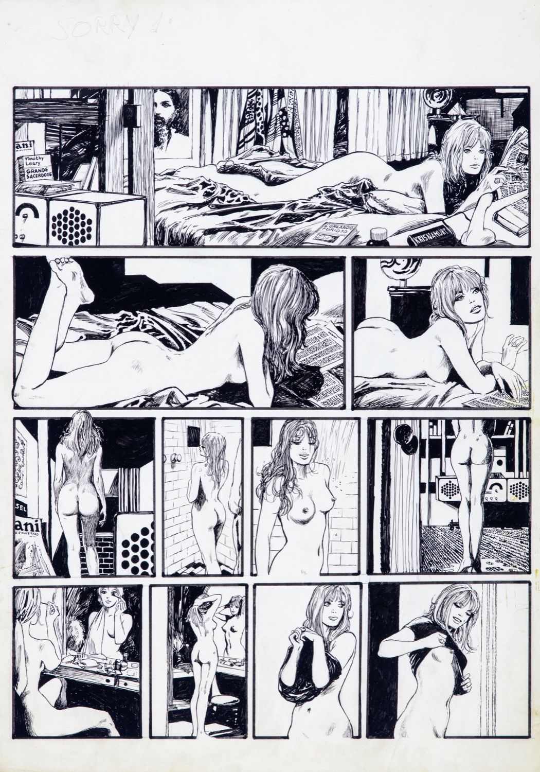 Tavola originale realizzata da Manara nei primi anni '70 per una storia horror/sexy rimasta inedita, destinata alla pubblicazione sul primo numero della rivista Sorry della Casa Editrice Persona. Fori di affissione al margine superiore e lieve piega al margine inferiore.