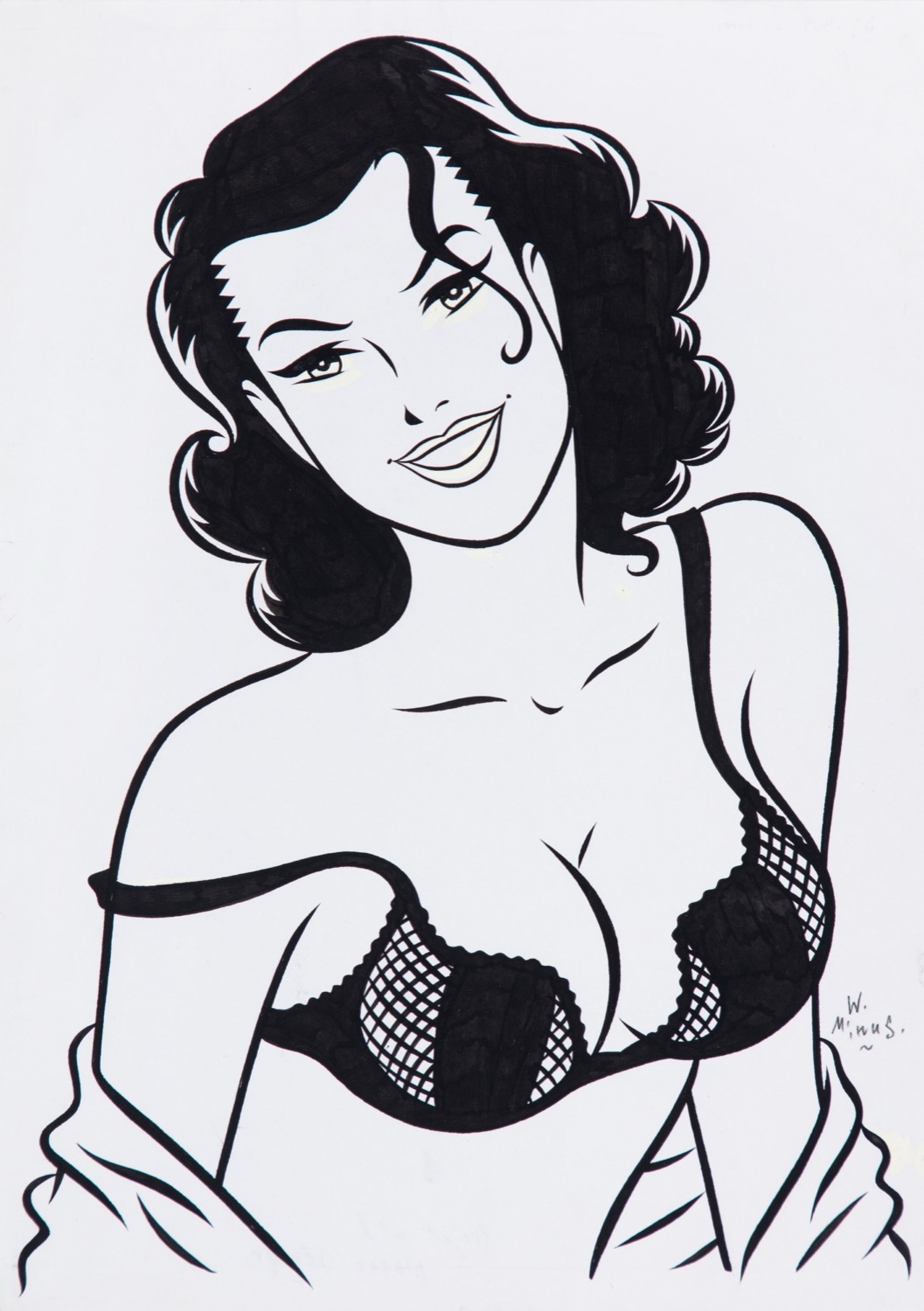 Illustrazione originale realizzata da Minus negli anni '90. Nato a Roma, diplomatosi alla Scuola Nazionale Superiore dei Mestieri e delle Arti Applicate di Parigi e illustratore per riviste come "Elle", "Lire", "Marie Claire", "Cosmopolitan" e "The New Yorker", Minus è un fumettista al confine tra la linea chiara e la pop art, ha dedicato la sua arte alla rappresentazione amorevole delle donne. Il suo segno essenziale, naturalmente elegante, fa di lui uno dei migliori artisti della pin-up art contemporanei. Firmata.