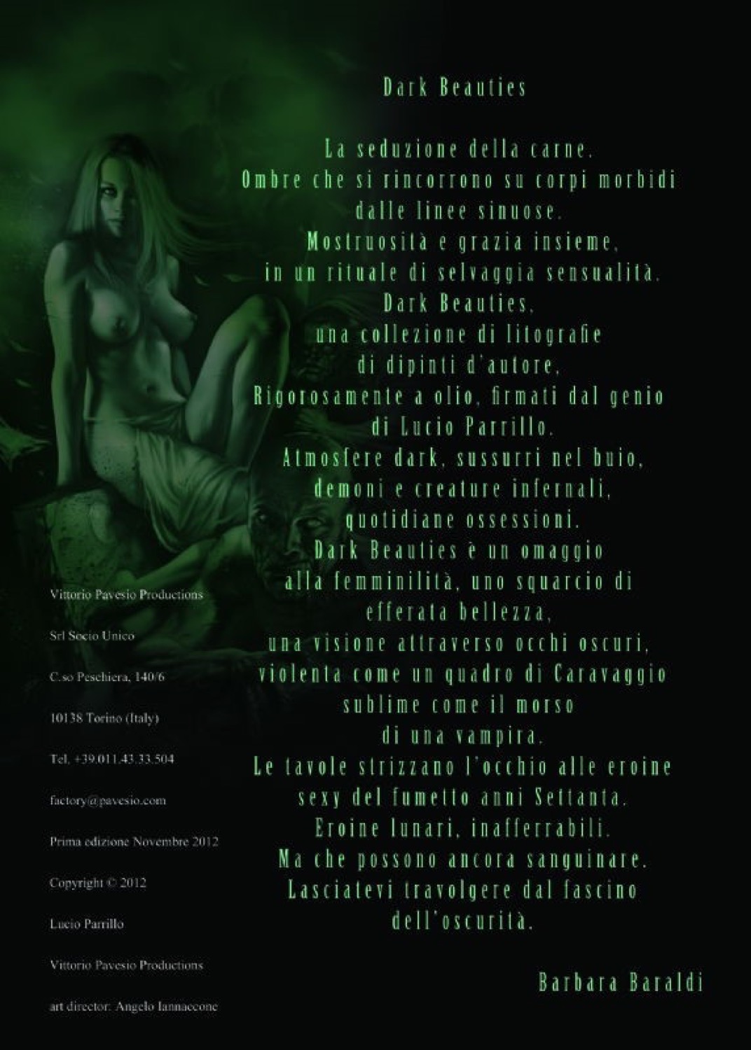 Dipinto originale realizzato da Parrillo come omaggio a Cimiteria, la affascinante zombie protagonista dell'omonima serie tra le più celebri del fumetto erotico tascabile italiano. Opera pubblicata sul portfolio "Dark Beauties" da Pavesio Editore nel 2012. " La seduzione della carne, ombra che si rincorrono su corpi morbidi dalle linee sinuose. Mostruosità e grazie insieme, in un rituale di selvaggia sensualità. Dark Beauties è un omaggio alla femminilità, uno squarcio di efferata bellezza, una visione attraverso occhi oscuri, violenta come un quadro di Caravaggio sublime come il morso di una vampira. " Fori di affissione ai margini. Firmato e datato al fronte e al retro.