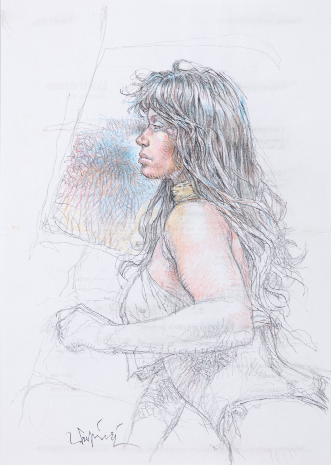 Studio originale realizzato da Serpieri per la sua sexy eroina Druuna, opera pubblicata sul volume "Druuna: Speranze" da Lo Scarabeo nel 2022. Con pochi tratti di matita Serpieri riesce a dare vita a un'idea, portandoci in una dimensione di puro erotismo e sensualità. Firmato.