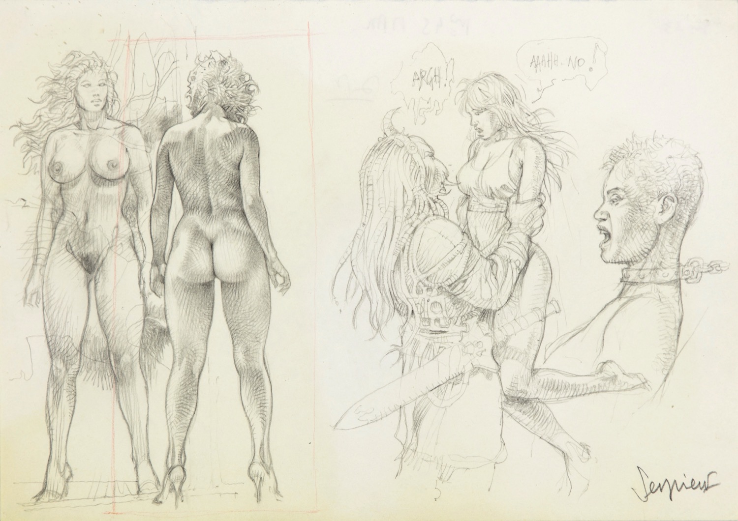 Studio originale realizzato da Serpieri per la sua sexy eroina Druuna durante gli anni '90. Con pochi tratti di matita Serpieri riesce a dare vita a un'idea, portandoci in una dimensione di puro erotismo e sensualità. Firmato.
