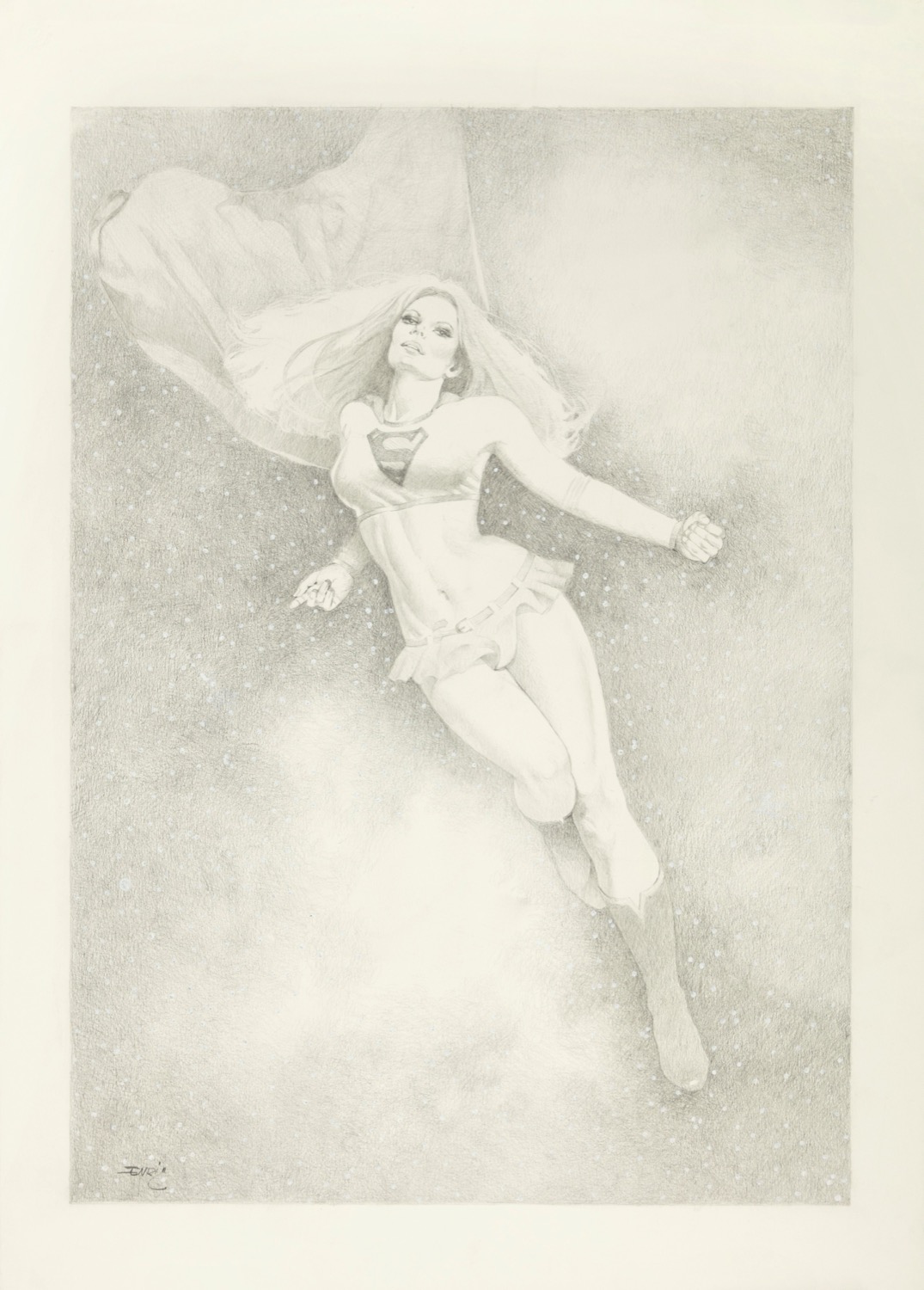 Disegno preliminare realizzato da Torres-Prat per uno dei suoi più celebri dipinti, raffigurante una sensuale Supergirl. Firmato.